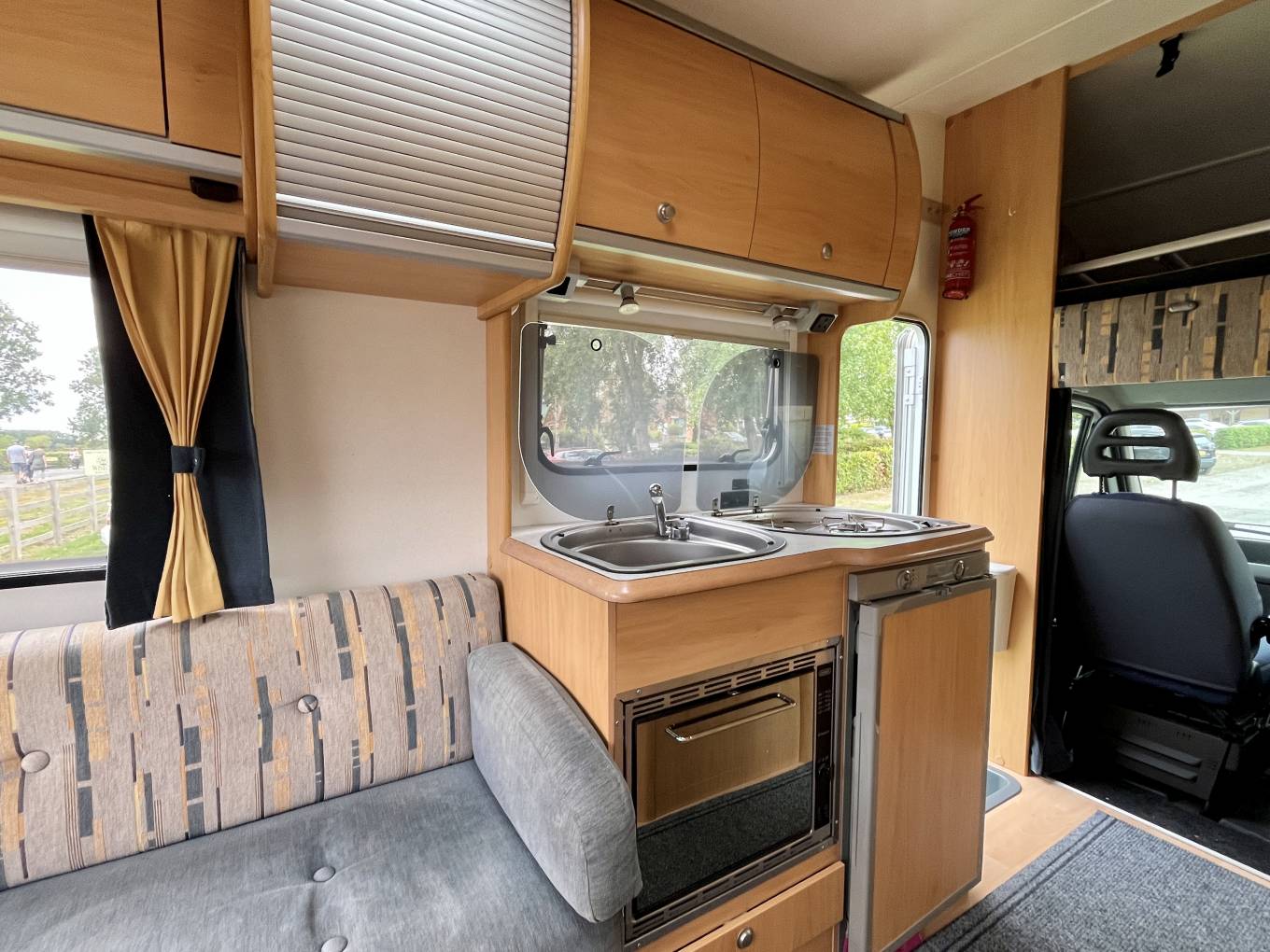 As you enter the van you will notice to your left the large over cab bed, (1.40M x 2.0M) with access ladder, this area can also be used a a very useful storage space. As you look into the van you you will see the well equipped kitchen area with 3 burner hob, sink with hot & cold water mixer tap, combination oven and grill, undercounter fridge and plenty of storage above.
