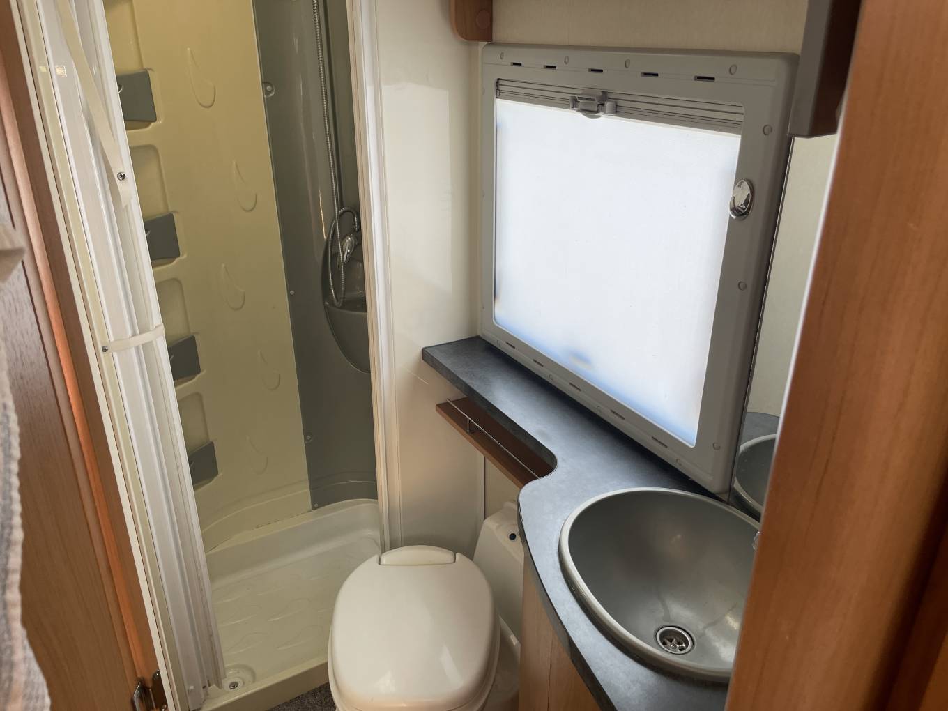 At the rear there is a comfortable looking French bed and a spacious washroom with all the facilities on board, and plenty of overhead lockers with storage for longer holidays.