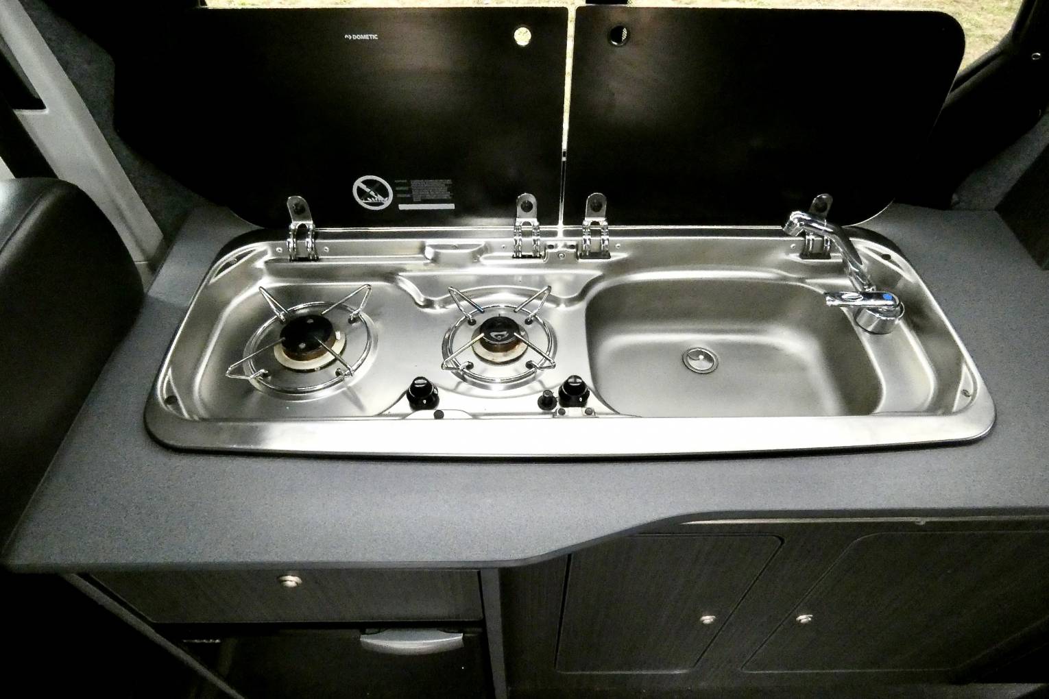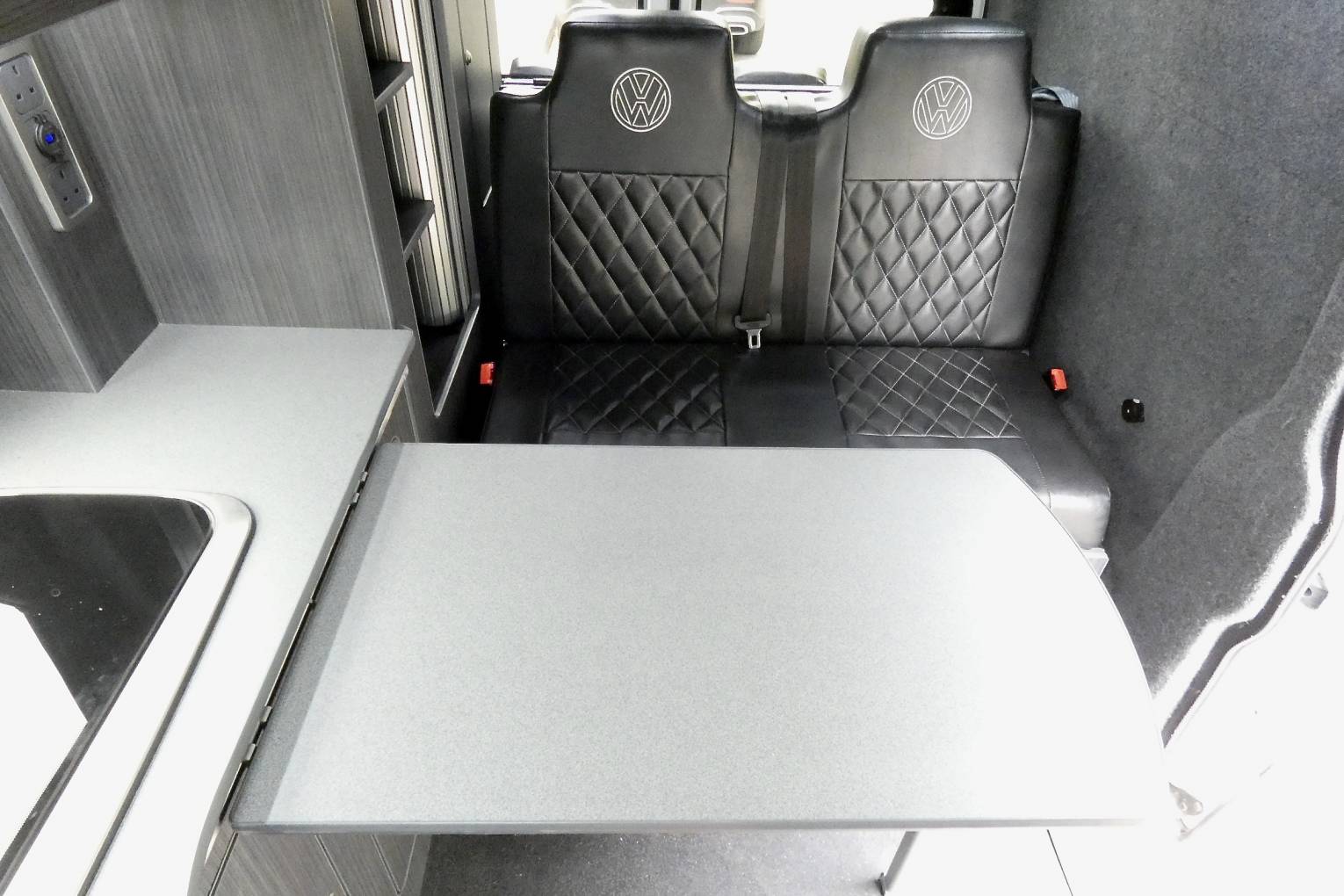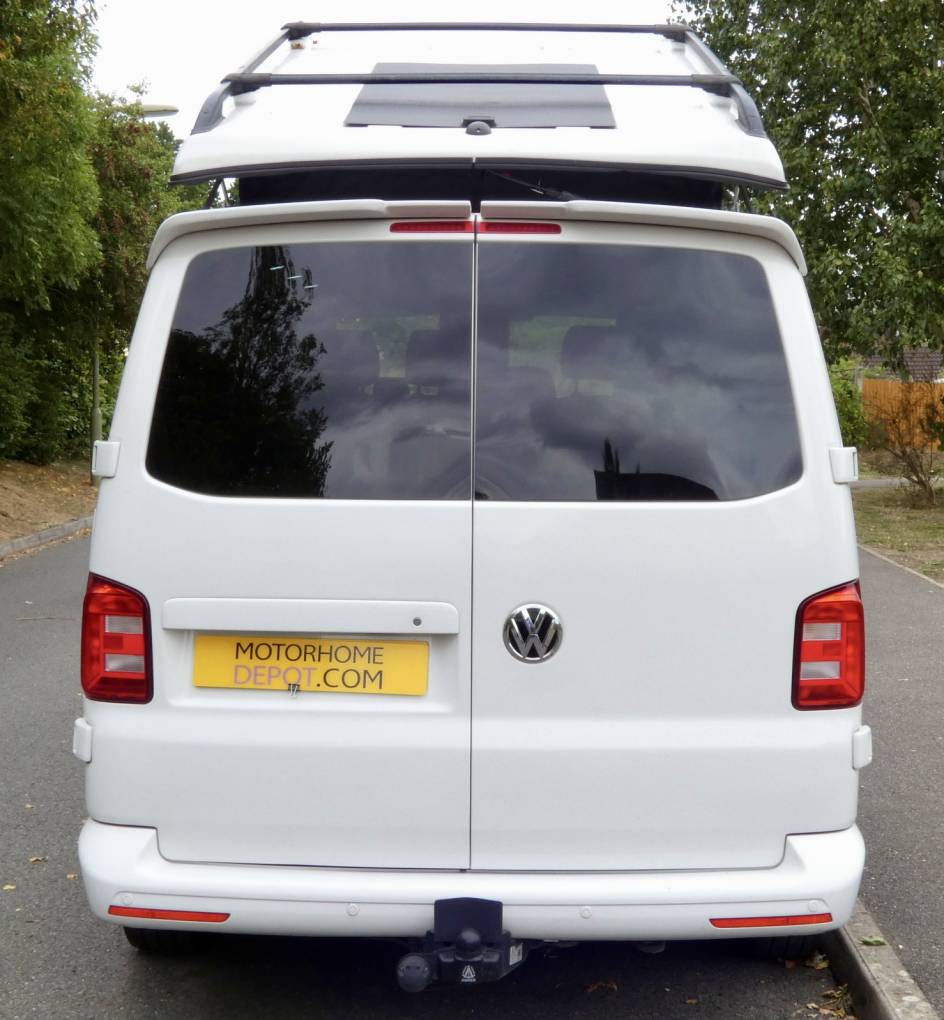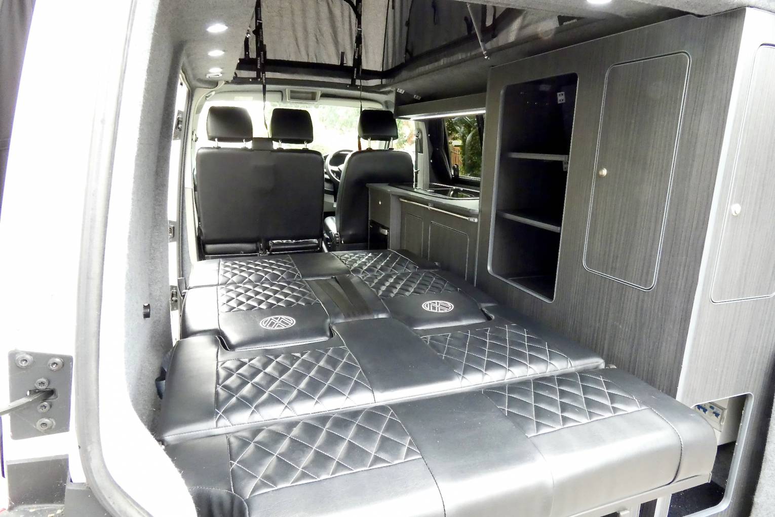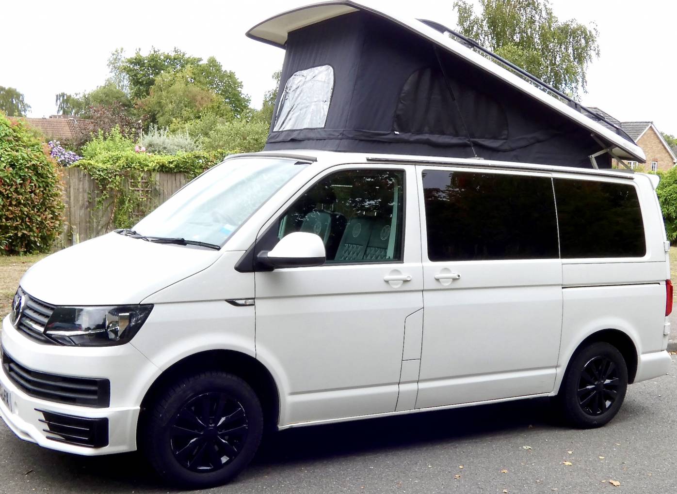 VW Camper van, nicely presented, 5 seat belts, 4 berth, alloy wheels, this vehicle is subject to VAT. The camper van is just having a new MOT, and about to have a habitation check in the next week. The conversion to the van was done by a company called (Metal & Threats based in Cornwall), giving the vehicle a very much a rock 'n' roll look with its black upholstered seating, ideal for wiping clean when there is sand and water on them, there is a roof rack for putting surfboards or a kayak on the roof.