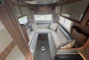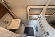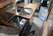The galley kitchen includes a sink, cooker with 3 gas burners and electric hob, oven and grill, then opposite a fridge/freezer combo. There is also a large pop-up worktop for food preparation next to the habitation door and attached fold away table for outside entertaining.