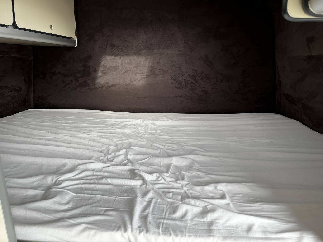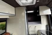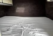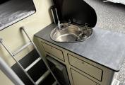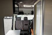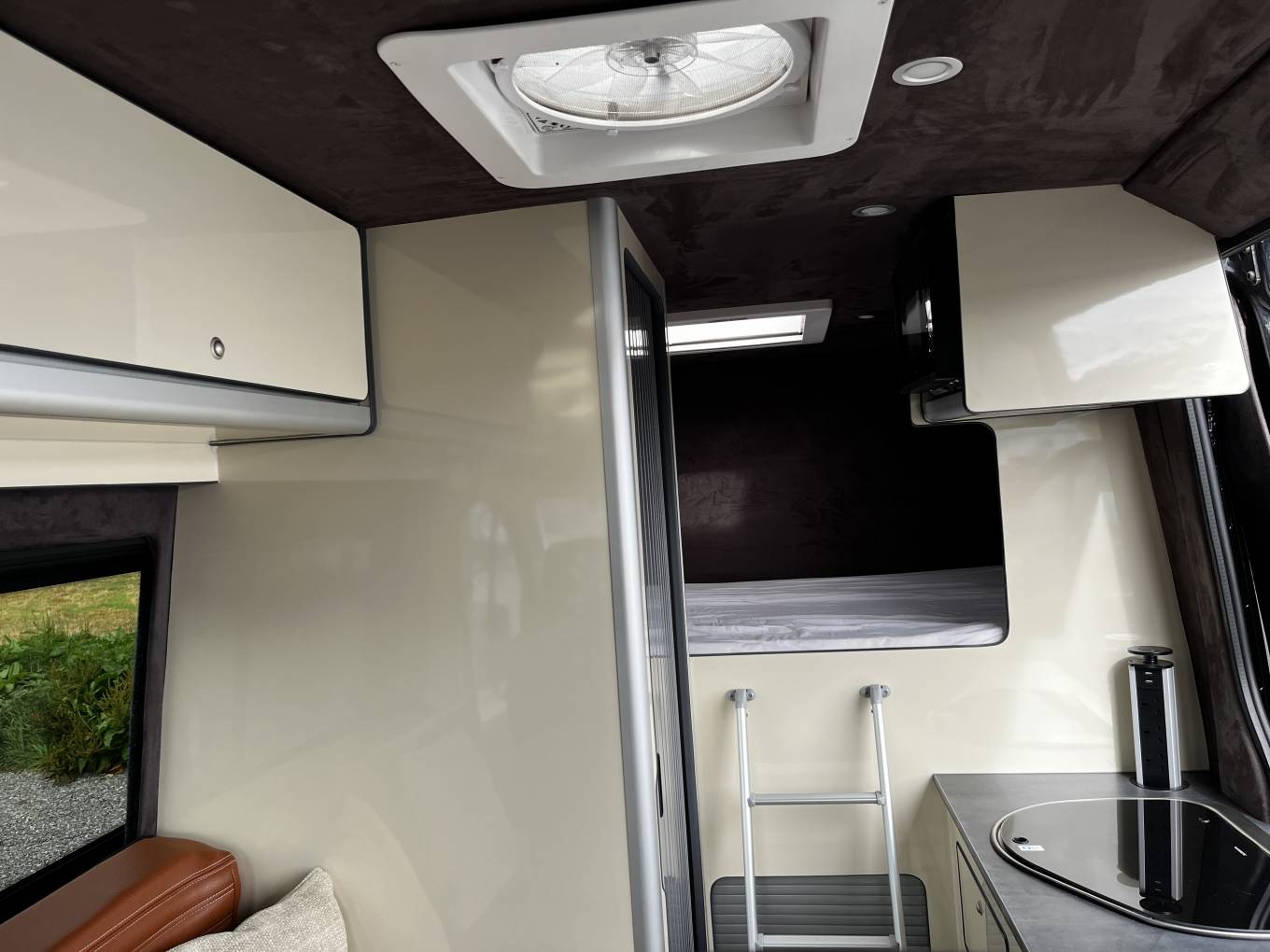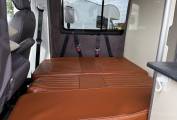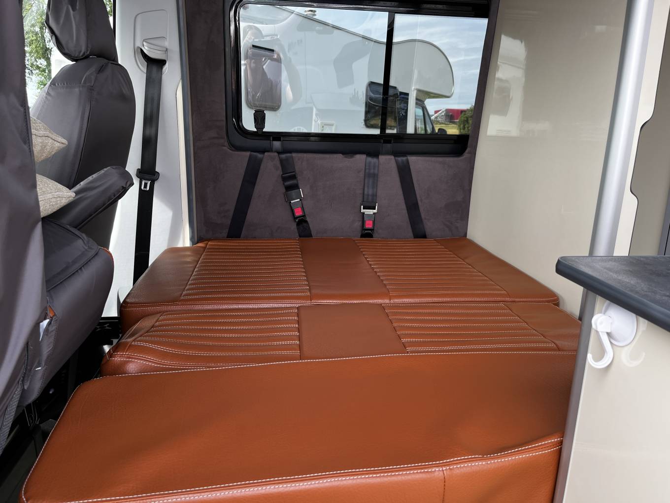 Sleeping – Raised Transverse double bed to the rear of the van with USB points, reading lights and ladder. Front bench seat can pull out to sleep two smaller children.