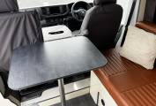 Living and Dining – Swivel seats from the cab, bench seat, Removable table stores in the garage, generous lighting and blinds on the windows.