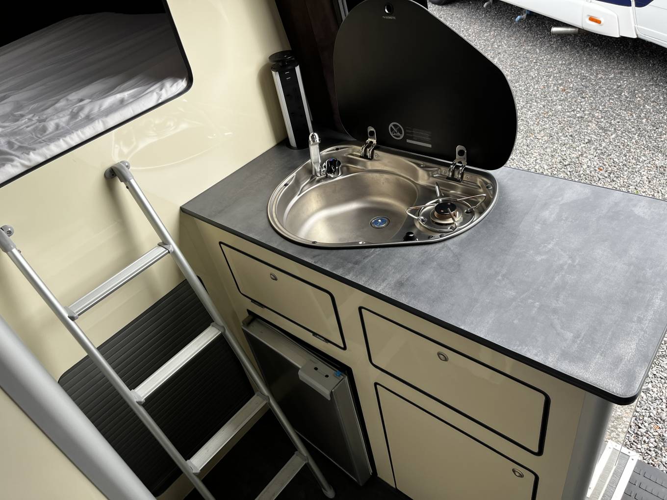 Kitchen – 1 x Burner gas hob, Sink with hot and cold running water, 12V Fridge, plenty of kitchen storage.