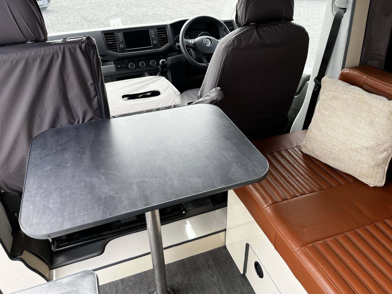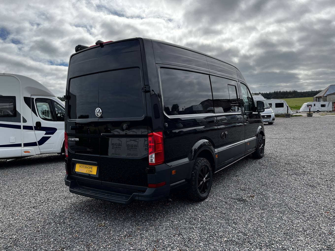 This VW Crafter has been carefully converted into a quality camper van with large garage under the rear fixed bed ideal for families and couples who love the outdoors. The cab benefits from 3 seats, Air conditioning, cruise control, Head unit with radio, MPI and Apple car play. Hot water and heating are provided by a Truma Boiler able to run of Electric or Gas. Timing belt changed in March 2023 and new tyres all round in 2024. Extras include Spare wheel, full tank of LPG gas, Porta Potti, Microwave, Kettle and pans.