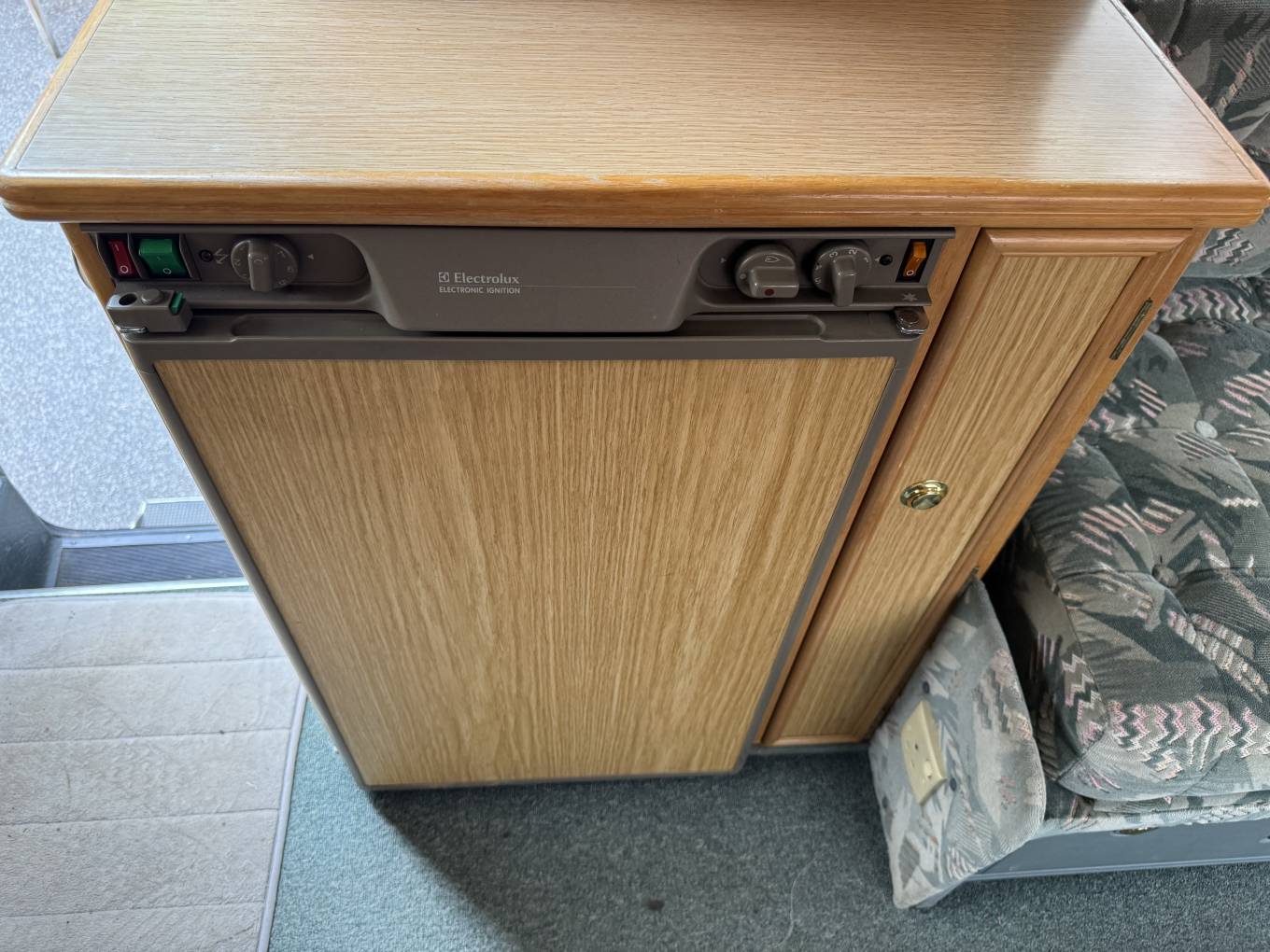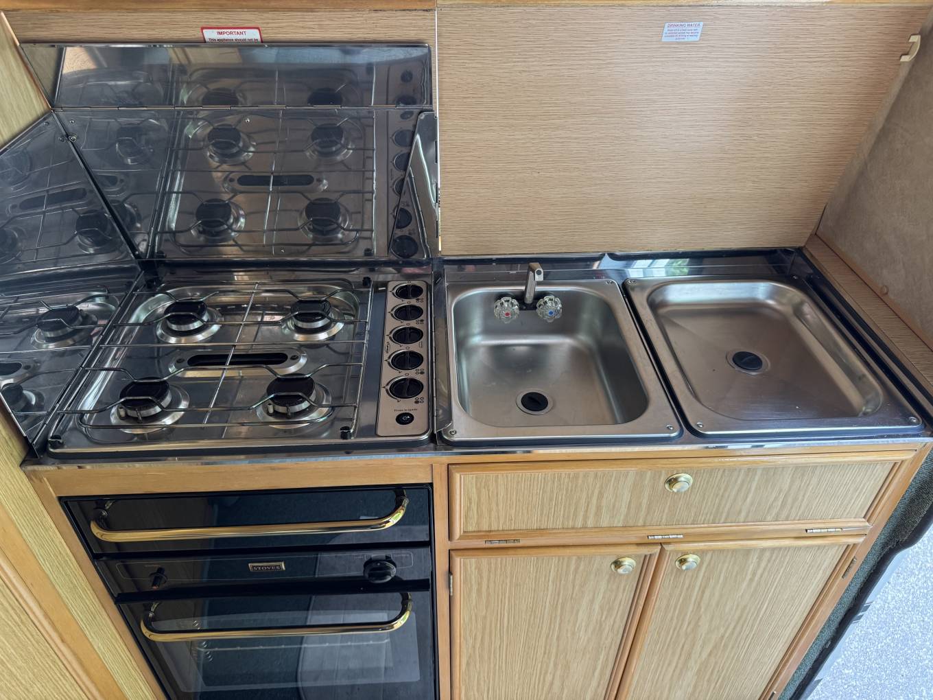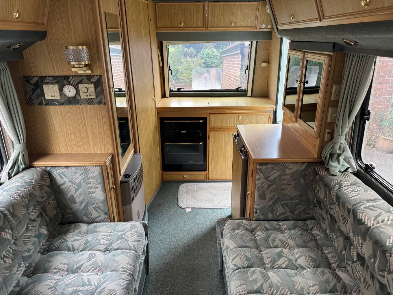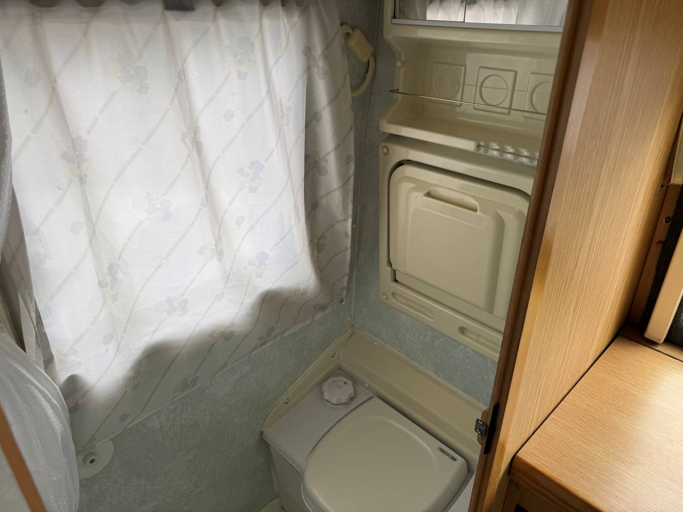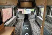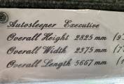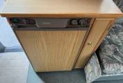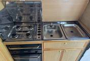 The Executive's layout is starting at the habitation door at the rear is the kitchen area that consists of 4 burner gas hob, grill, oven, handwash basin and a 3 way fridge. Adjacent to this is the washroom that has a Thetford bench toilet, drop down space saving handwash basin and shower controls.