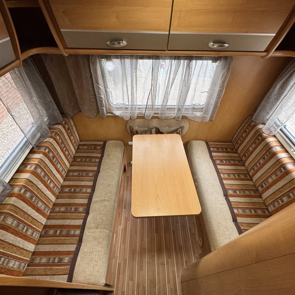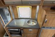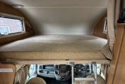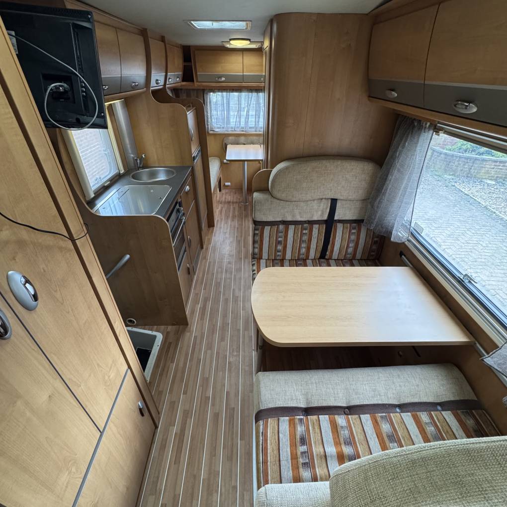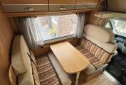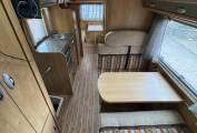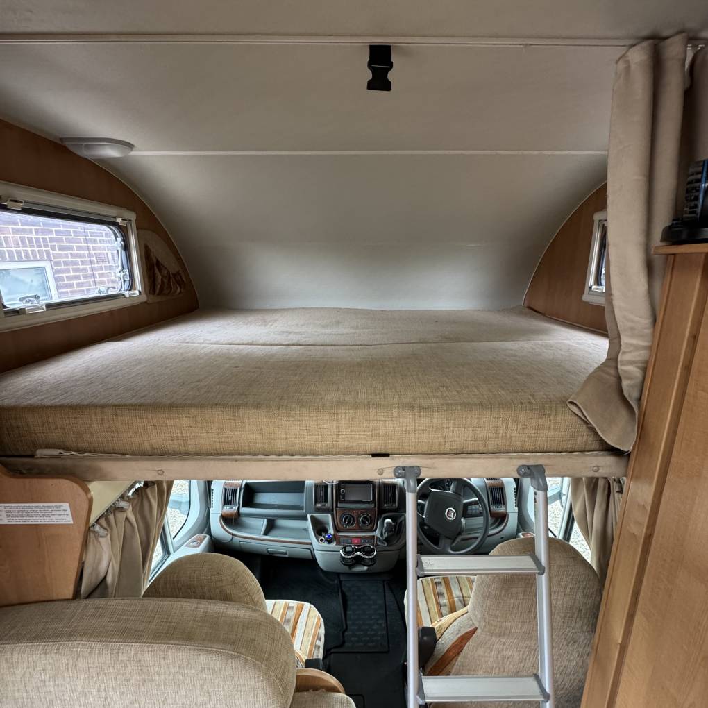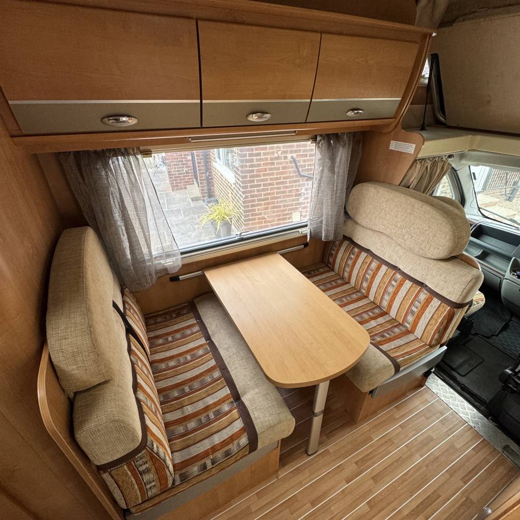 Across you have a large kitchen area which comes complete with a large 3 way fridge, 3 gas hob, oven/grill, prep space, sink and mixer tap. Moving forward you have a spacious centre dinette to wine and dine in. This again can make up into a good sized bed for you or your guests. Up top above the cab you have a very large over cab bed, easy access and plenty of light for a good nights slumber.