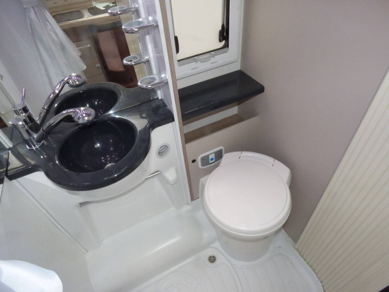 Sleeping accommodation is in the large rear fixed bed, with washroom including cassette w.c. head height shower, sink and vanity unit. The front dinette with two forward facing seats with seatbelts can also be converted into a berth. The front seats swivel to face the table and dinette area which can seat 5. The kitchen area has microwave, 3 ring gas hob, sink and fridge. A Truma boiler heats the water and there is a diesel heater which is very efficient in terms of speed and cost. The vehicle will be sold with a gas bottle (not in photos).