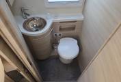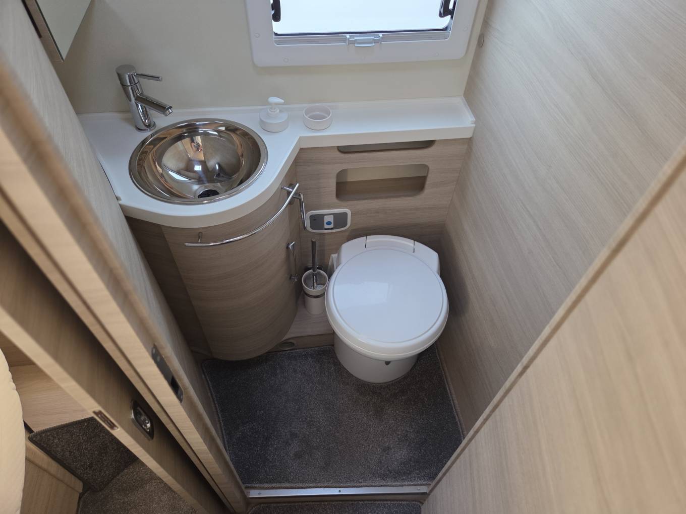 The nearside washroom proper has a swing-out cupboard located below the handbasin, a large mirror and an opaque window behind the toilet.
