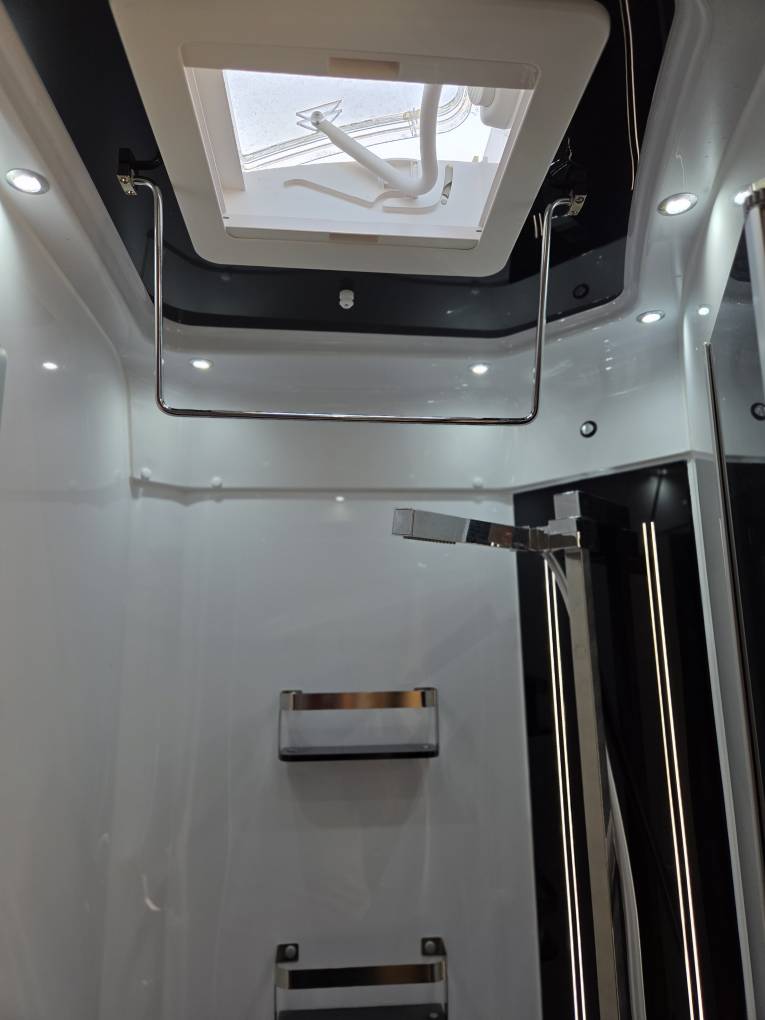 The offside shower in the central washroom is well lit and comes with a roof vent and plenty of shelf space.