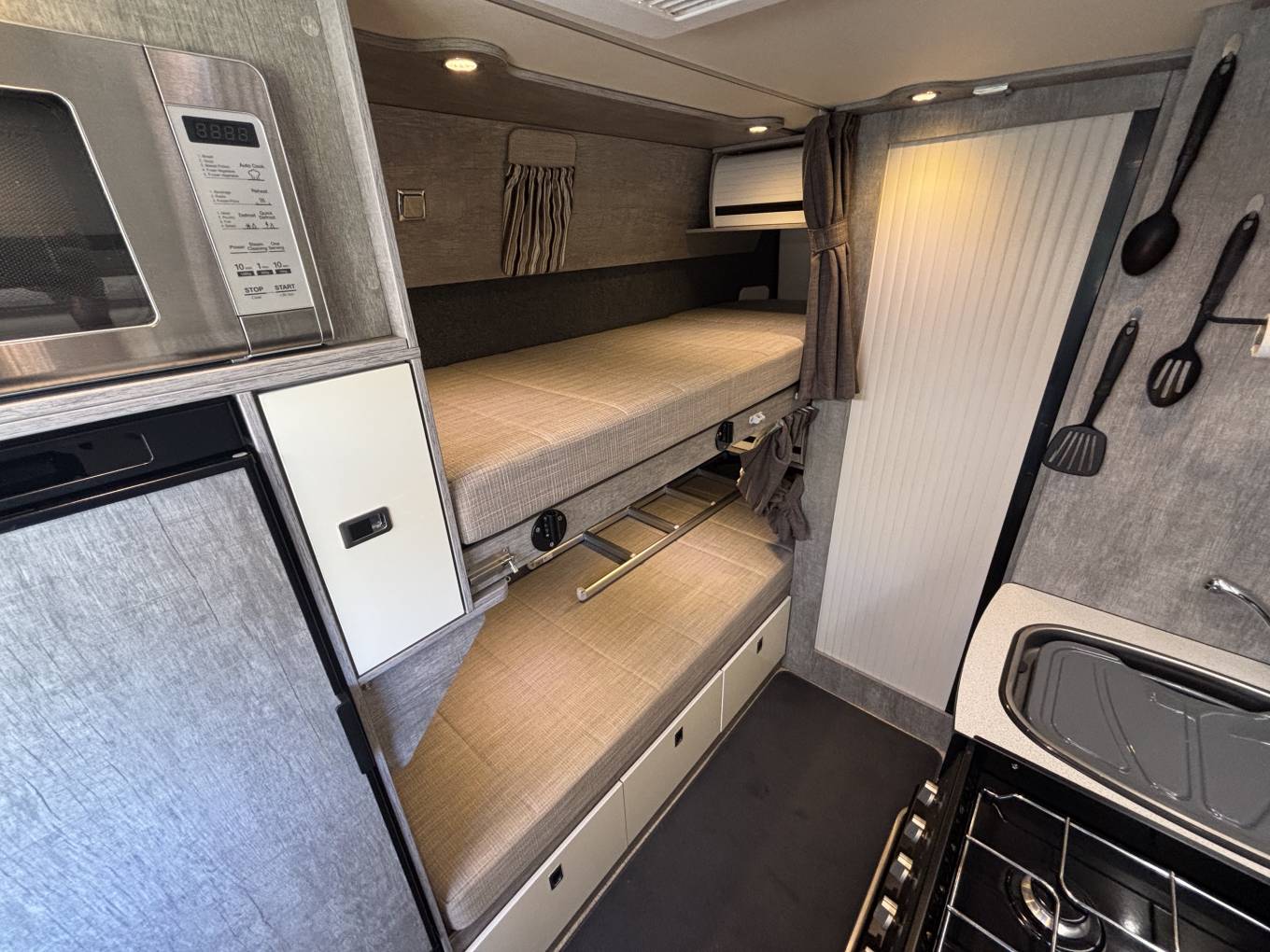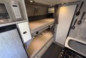 Layout - Starting at the rear the Wildax has a rear washroom with fitted hot and cold fixed sink, Vanity Mirror, Toilette cassette, Overhead Locker and Overhead shower. The washroom can also be cleverly accessed from the rear of the Camper when the back doors are fully open. To the right of the washroom you have the rear fixed bunk beds, both beds are a fantastic size and easily sleep two adults not just children! when not in use the top bunk can also be lifted out the way to create a second rear lounge a brilliant unique feature. The kitchen sits in the middle of the Motorhome and is made up from a 4-gas burner, Oven & Separate Grill, hot and cold mixer tap with sink and prep space as well as a large 3-way fridge with separate freezer draw and an overhead Microwave.