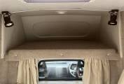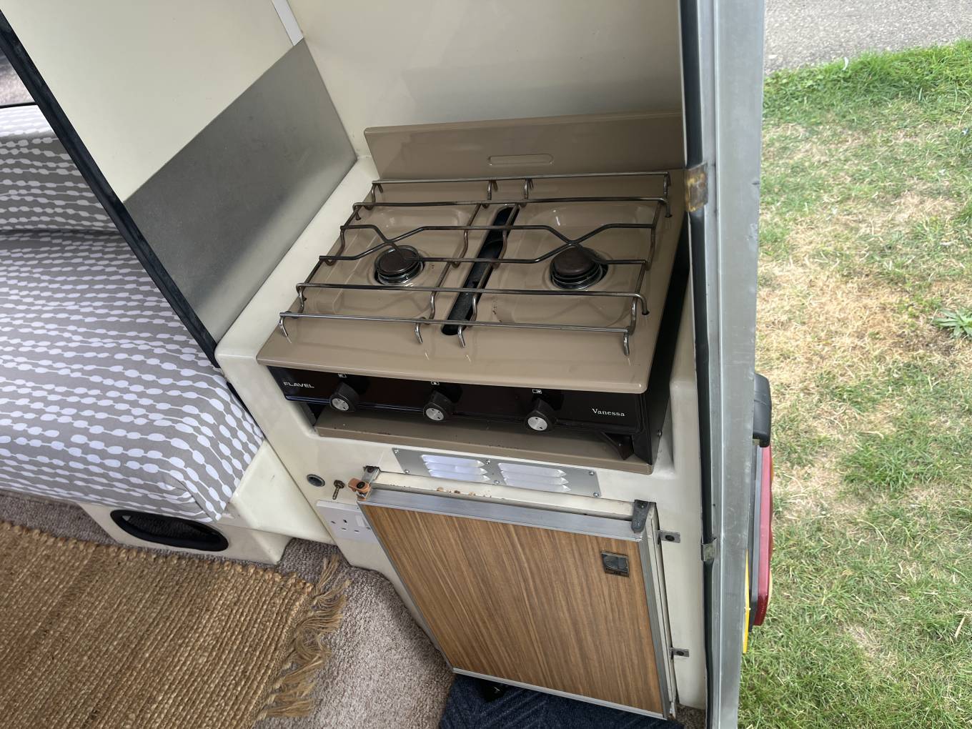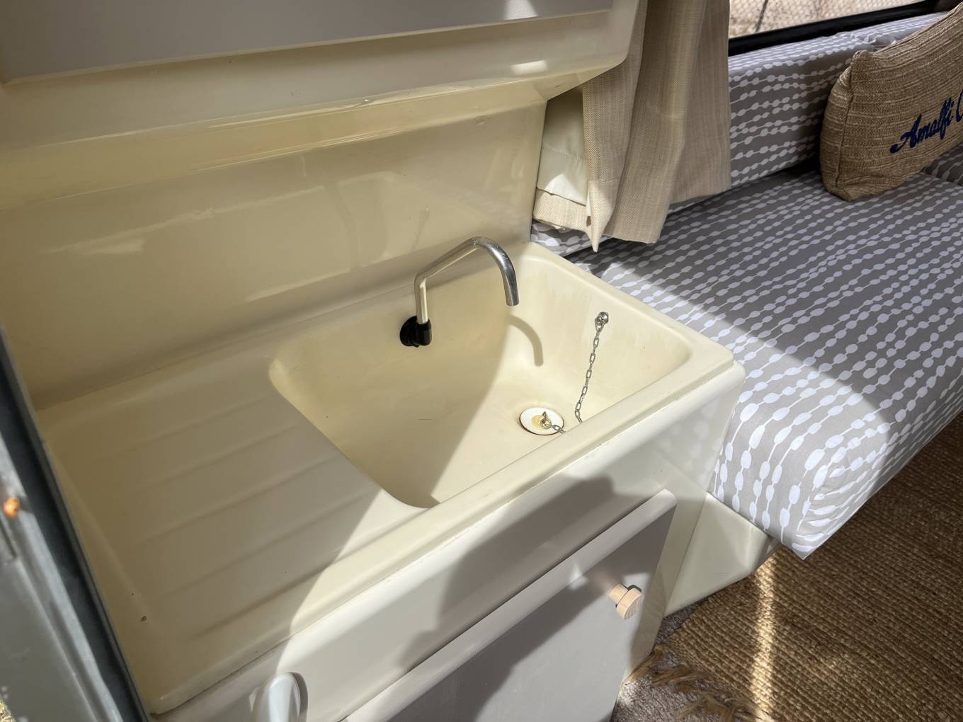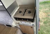 Inside, the Romahome is cleverly laid out to maximize space. The seating area converts into two single beds measuring approx. 6’ by 21”, and there’s a small kitchenette with a gas hob, grill, sink, and storage cupboards for cooking essentials as well as a gas fridge. Despite its compact size, the design emphasises comfort and practicality, with good use of vertical storage and a bright, airy interior.