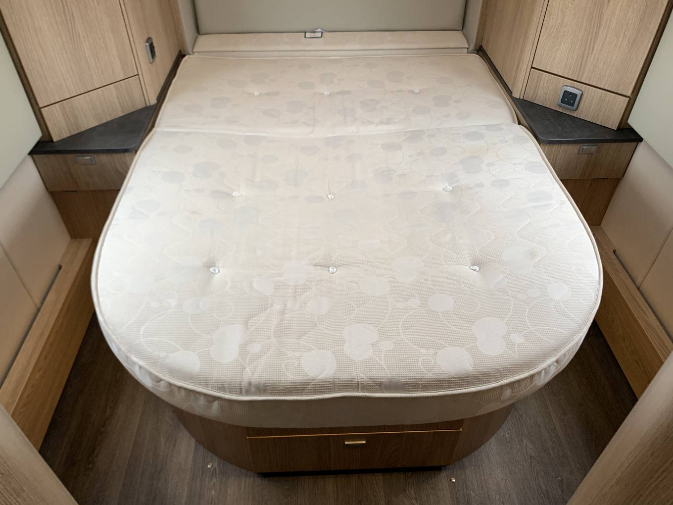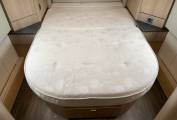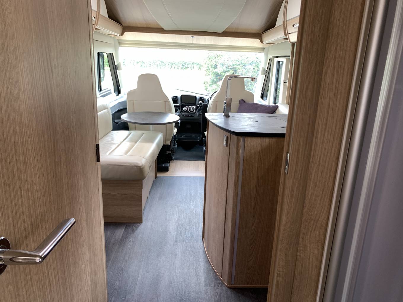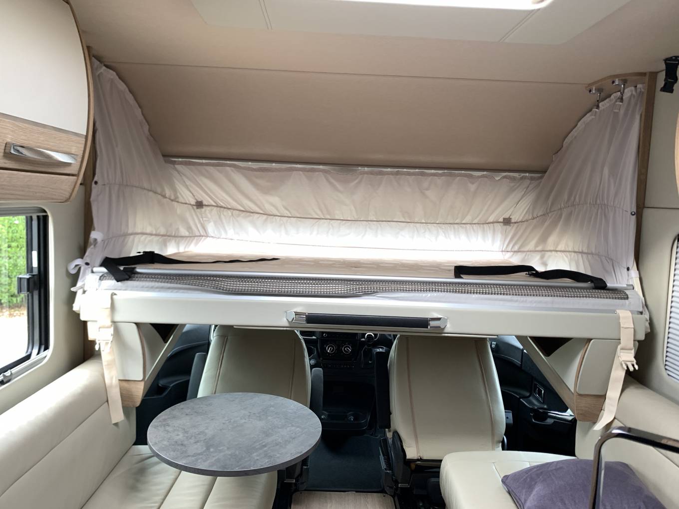 Layout features a rear island bed with a further drop down double above the lounge, its a 4 berth, but bear in mind there are no extra belts for passengers. The appeal will be for couples looking for seperate sleeping areas with space to relax, ideal for long stays at home or in Europe.