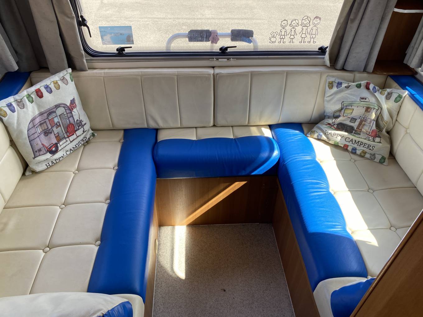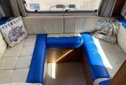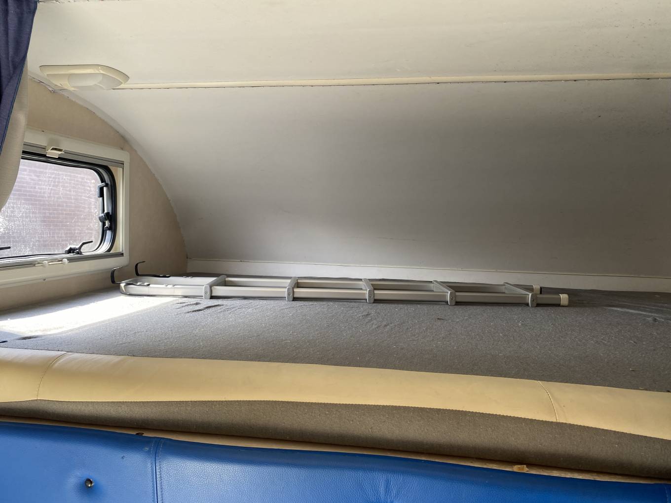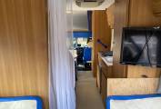 The layout is quite rare in an older motorhome with a rear lounge that forms a double bed, a foldout double in the dinette and a very spacious overcab double bed up front. The upholstery is leather, there are 4 three point seatbelts and 2 lap belts.
