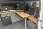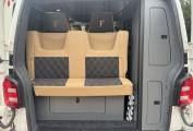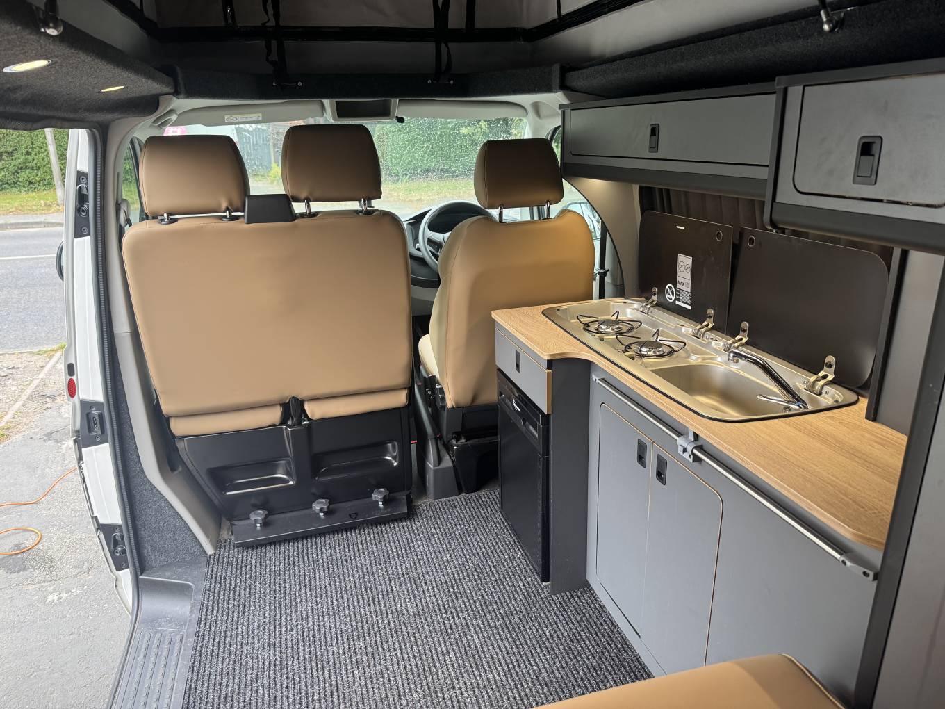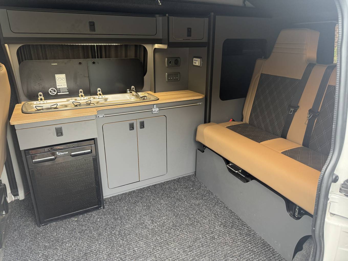 This high level quality conversion offers a 4 berth sleeping capacity along with 5 travelling seats. The cab which boasts 3 of the 2 travelling seats also has the 2 swivel chairs that can be turned around using the swivel plate to face the centre dinette and the remaining 2 travelling seats. These seats are also able to slide forwards and backwards to give you more space when turning. In the Cab there is a touch screen interface which includes radio, bluetooth phone and A/C and. There is also a heated front windscreen which is ideal for the winter frosty mornings.