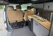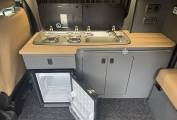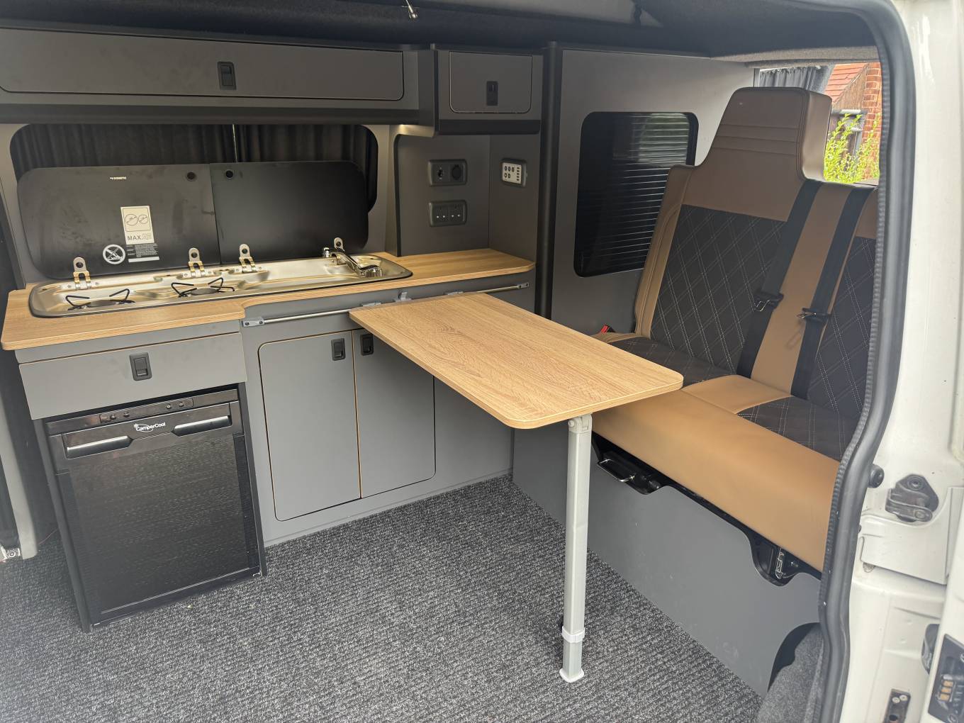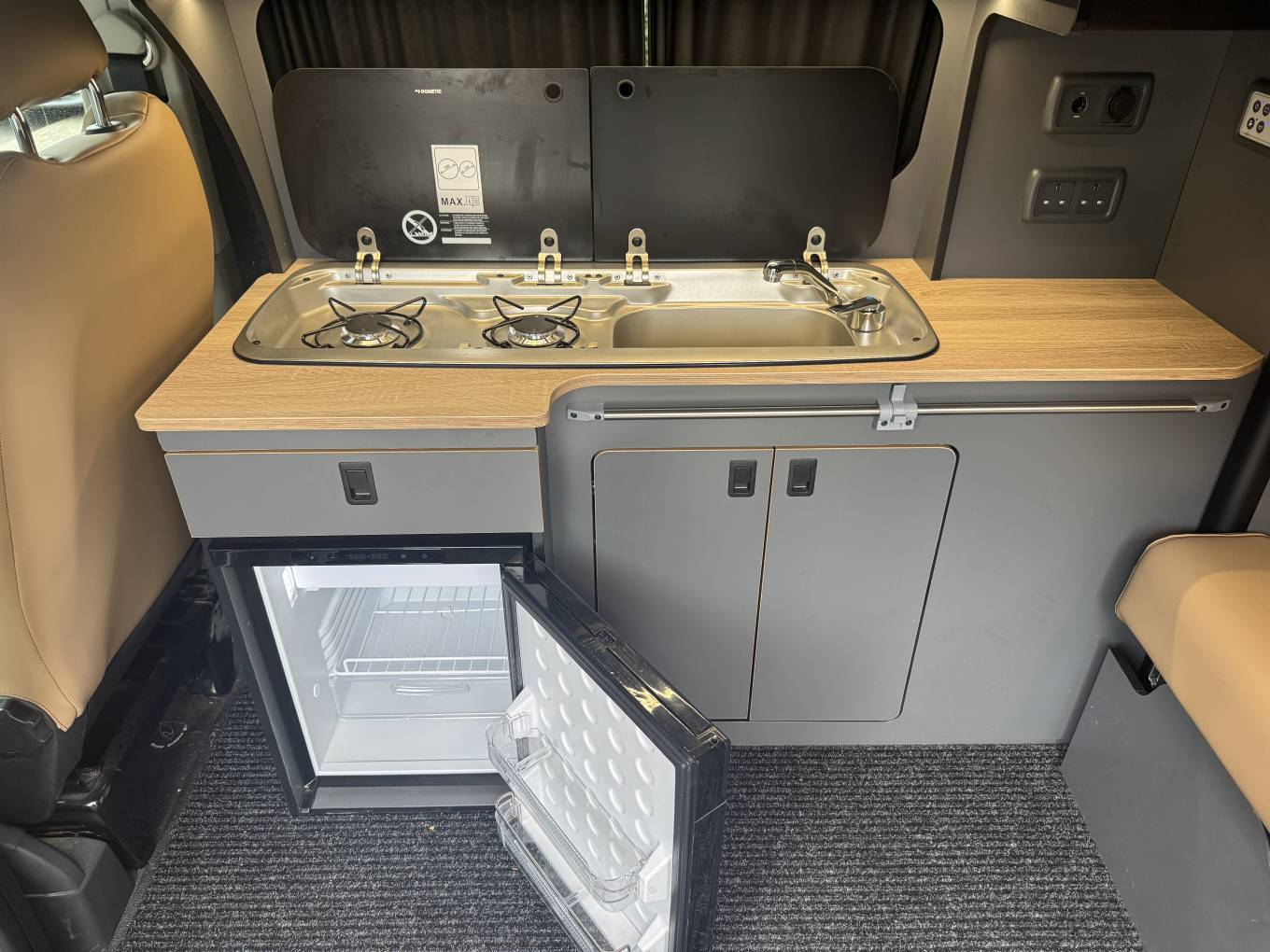 The centre dinette includes 2 ring gas hob, stainless steel sink and a good sized fridge with freezer compartment. In this area, there is a removable dining table which is positioned between the 5 travelling seats. .