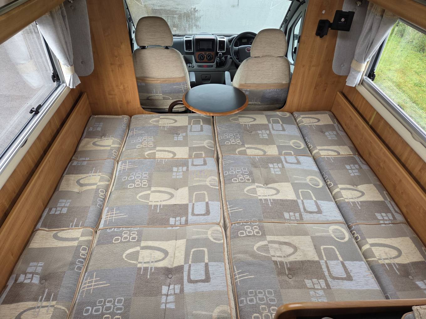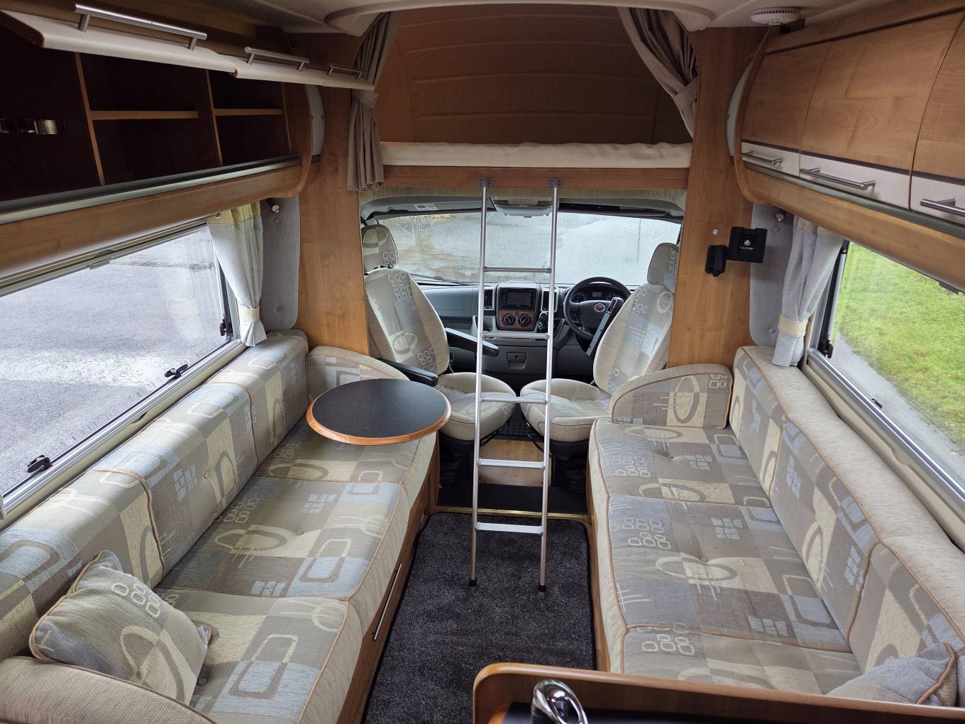 Above the cab area, we have another generous double bed which is accessible by a store away ladder. Bedtime reading lights are fitted in this area.