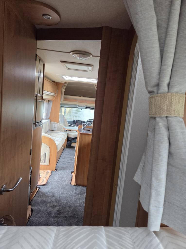 Layout - The end bedroom space boasts the fixed double transverse bed with surrounding storage that sits above the garage space. In front of the bed you have the bathroom and the desired separate shower cubicle at either side. The bed and bathroom area can be shut off from the rest of the motorhome. Across from the habitation door is the kitchen area and here you have everything you need including plenty of prep space and a modern 3 way fridge with separate freezer space, microwave, 3 x gas hobs, 1 electric plate, separate oven and grill and mixer tap with sink unit. You also have a large wardrobe area just next to the fridge.