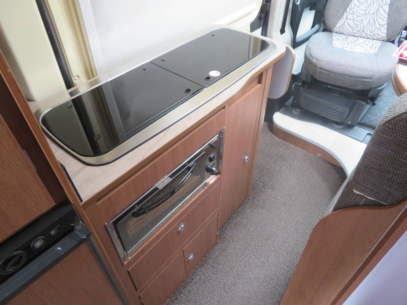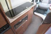 The kitchen is in front and to the right as you enter where you will find a three burner hob, grill, sink with a draining area, a three energy source Dometic fridge and an extending worktop with drawers below.