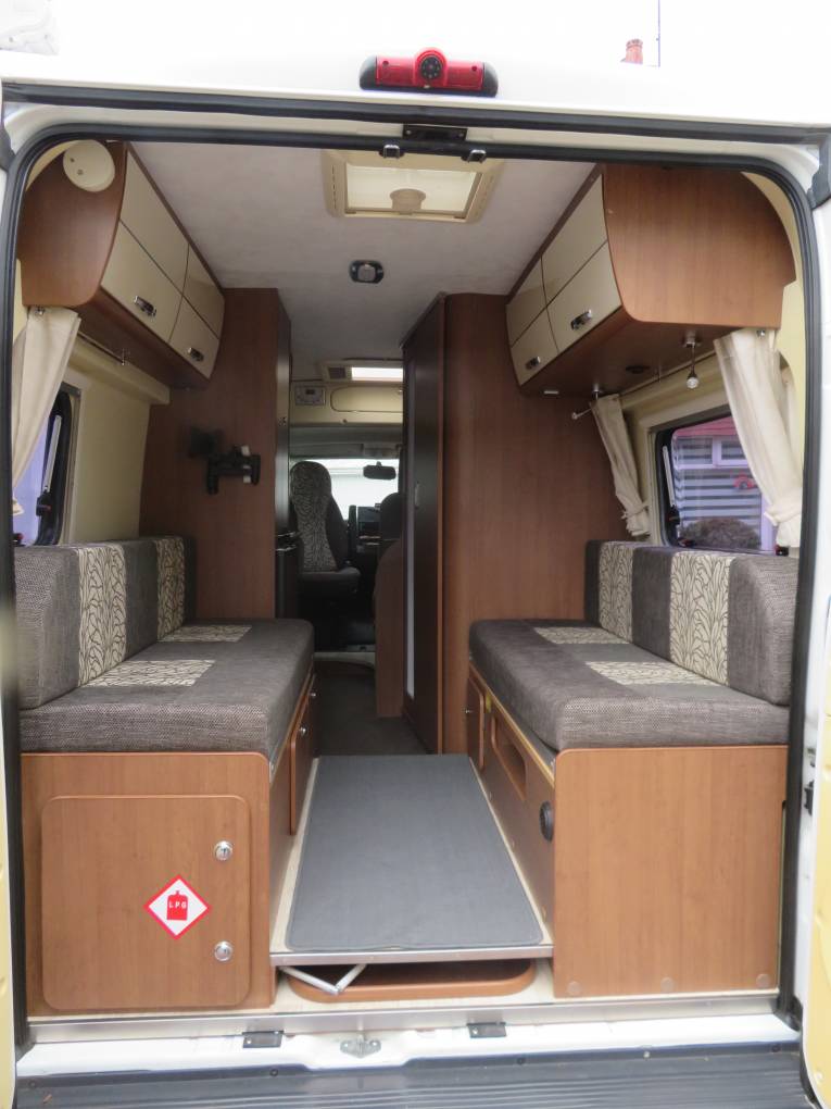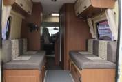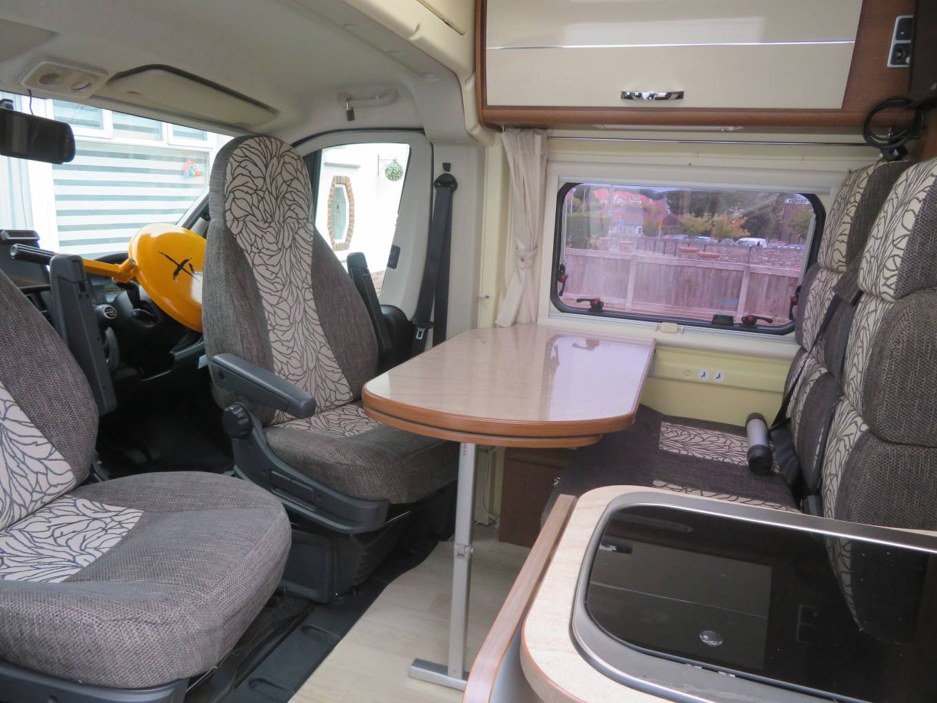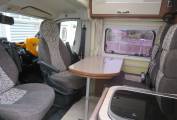 On entering via the large sliding side door to your left are the two swivelling cab seats with some roof storage above and in front of you two forward facing belted seats with a side attached extendable table forming a half dinette.