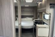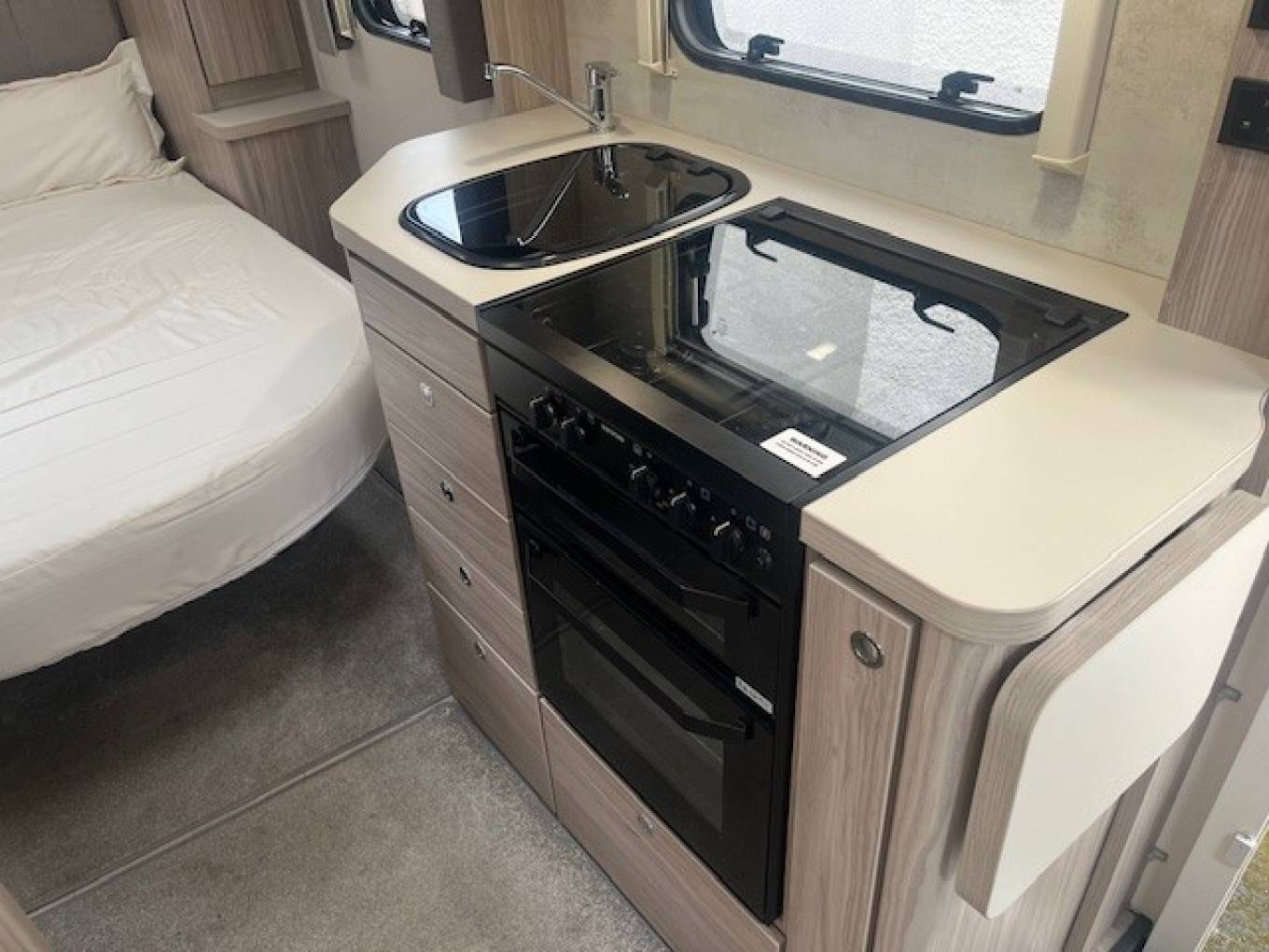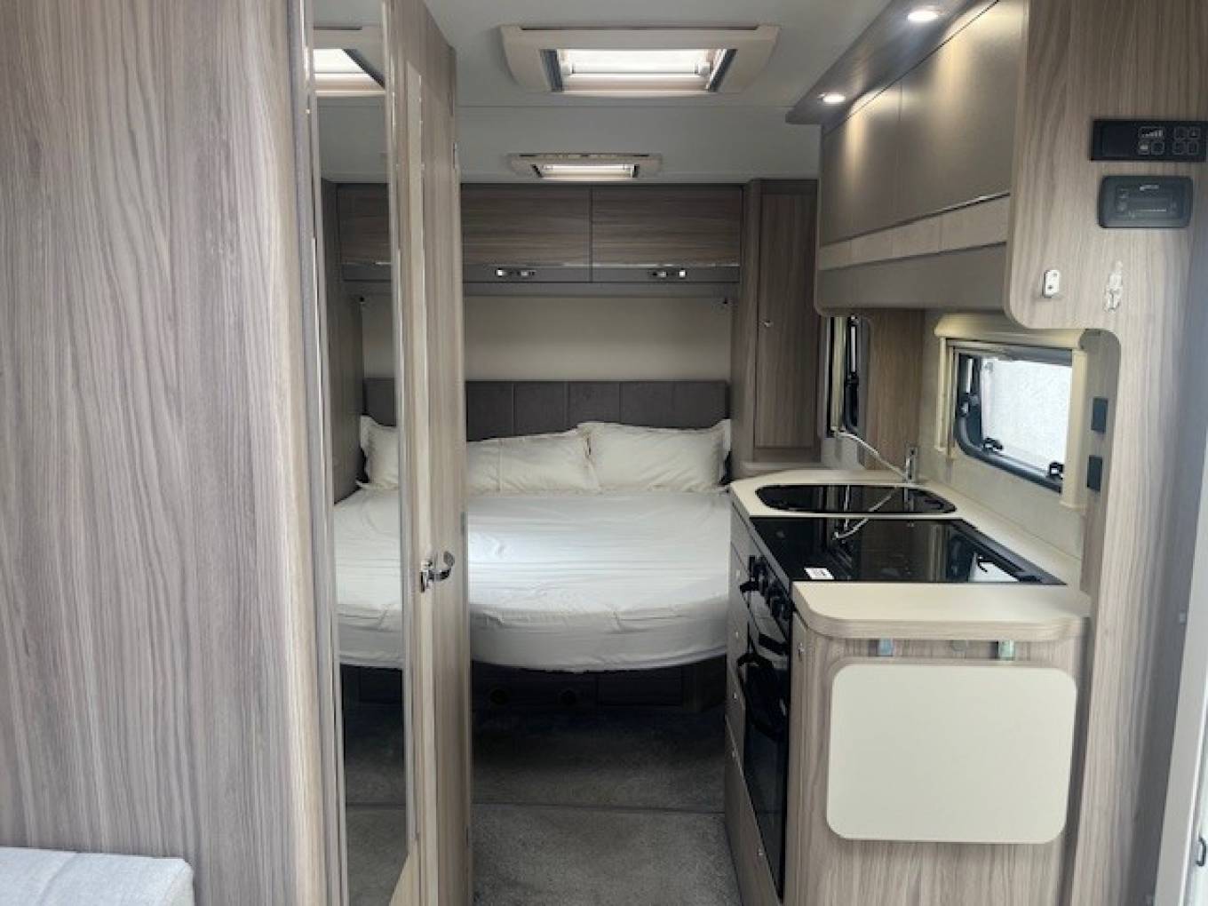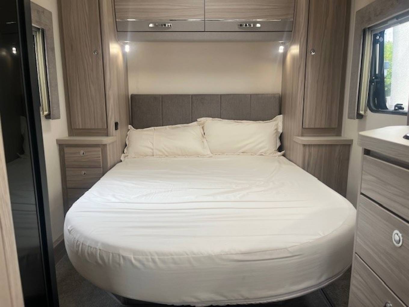 Sleeping is via the Rear Luxury Fixed Island Double Bed. This bed can be raised to provide access to a Large Storage Space - which can also be accessed externally