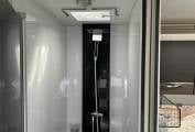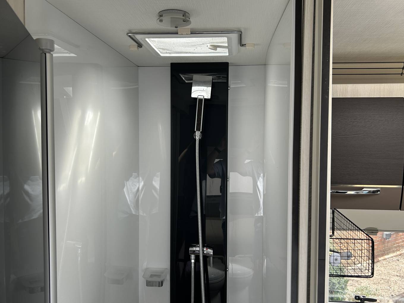 To the rear, the luxurious end washroom is exceptionally spacious for a motorhome of this size. It features a separate shower cubicle, WC, wash basin, and a huge storage cupboard – a rare and desirable feature in a compact 6m motorhome. There’s also a large external rear storage locker, providing plenty of space for outdoor furniture, bikes, or holiday essentials.