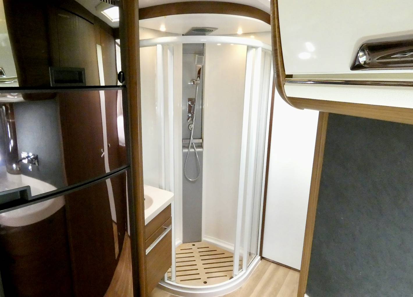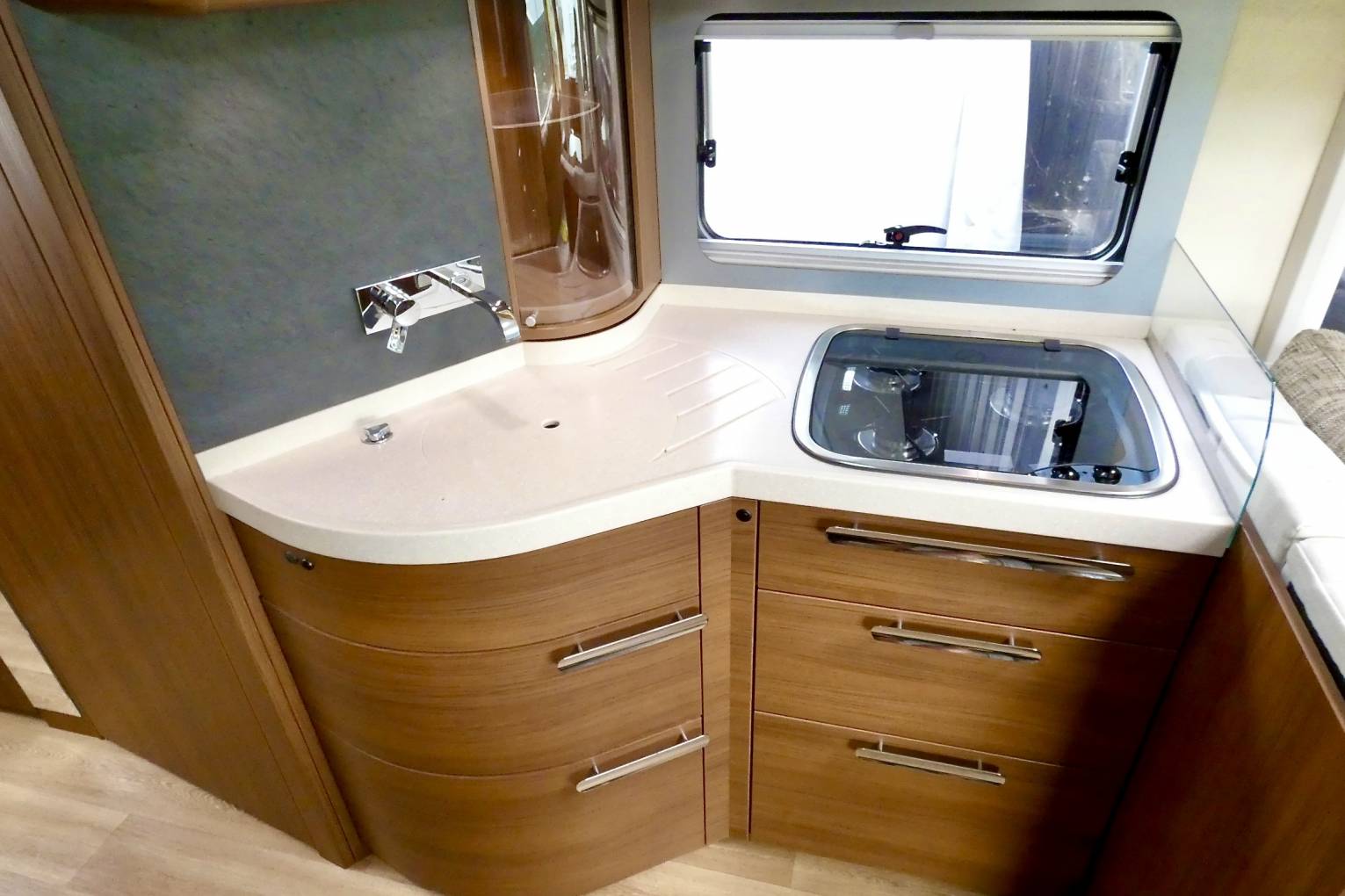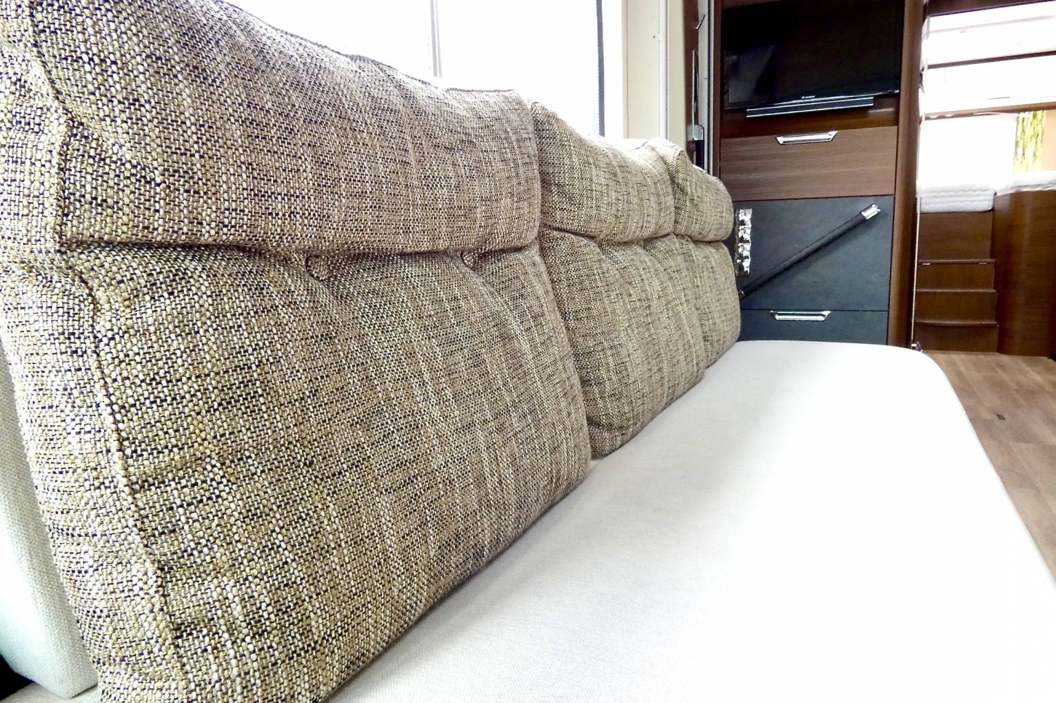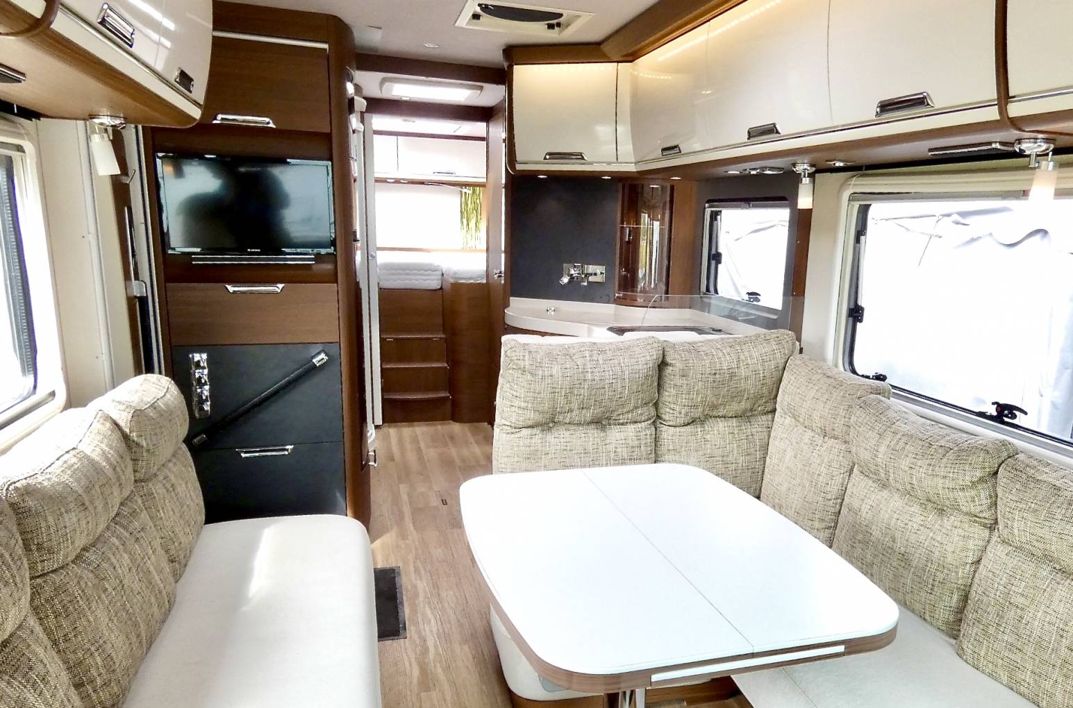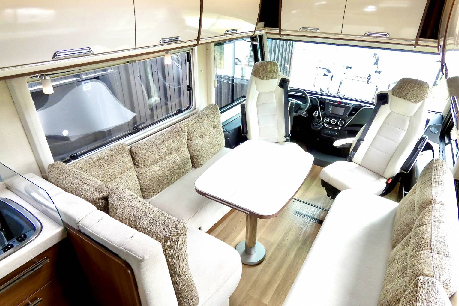 - You can see the quality in the luxury of the living area by the thickness of the seating and the quality of the fabrics that have been used, throughout this Motorhome, as you walk through this Motorhome, the way the living area through to the kitchen, bathroom and bedroom all coordinate, in both the wood, fabrics and colour scheme all combine together to make an exclusive and exquisite Motorhome to living whilst travelling.