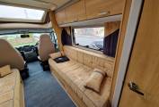 Moving to the front, the whole area has a very light and airy feel to it, with light flooding in from the large sunroof over the cab and the light coloured upholstery ensuring the area is nice and bright. The opposite facing sofas make an excellent social area and,with the free-standing table, this is also a perfect place for dining. This area also benefits from a TV.The sofas quickly make into a large double bed, but it would also be possible to use these as single beds.