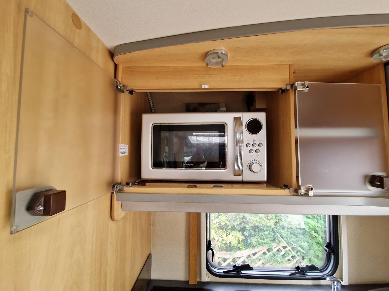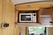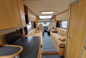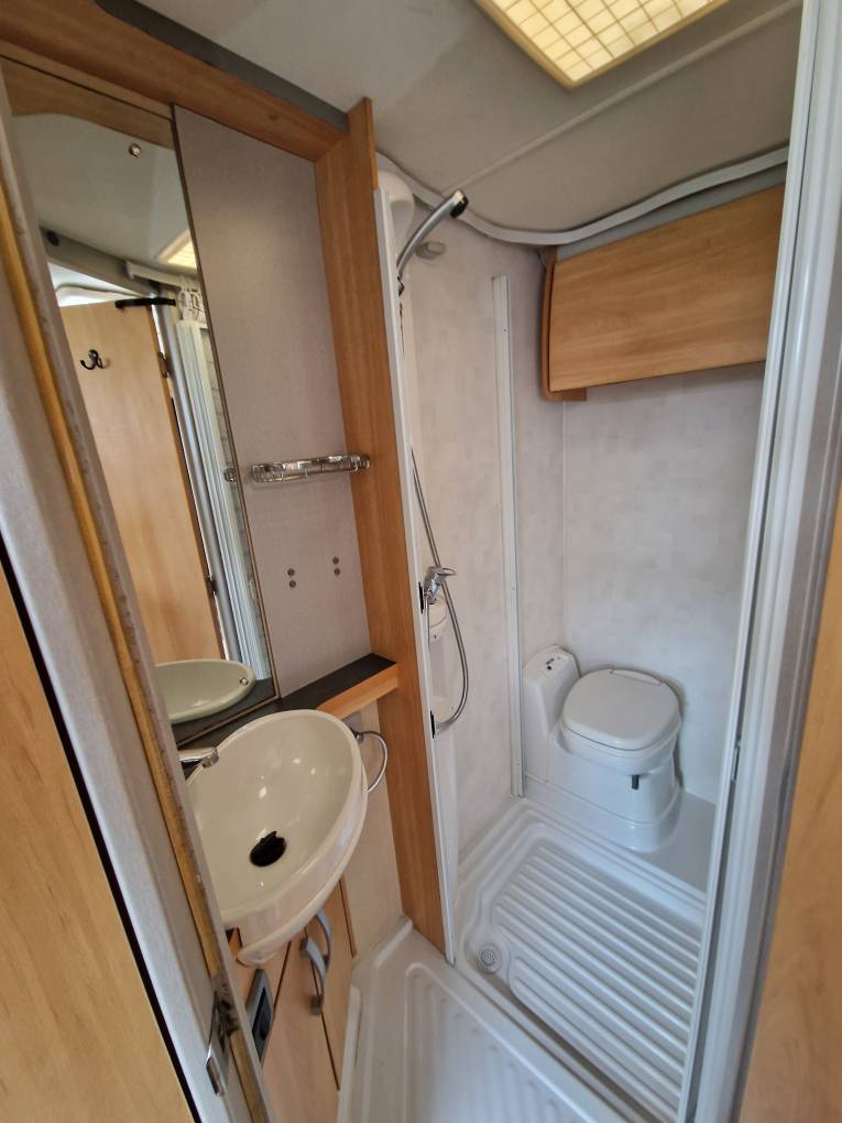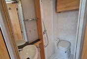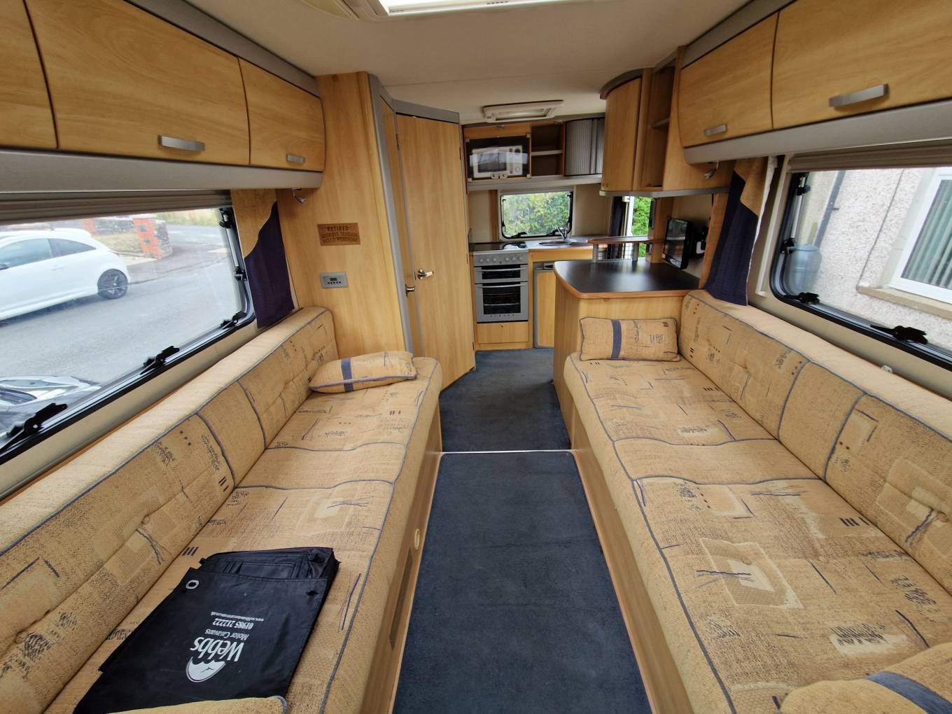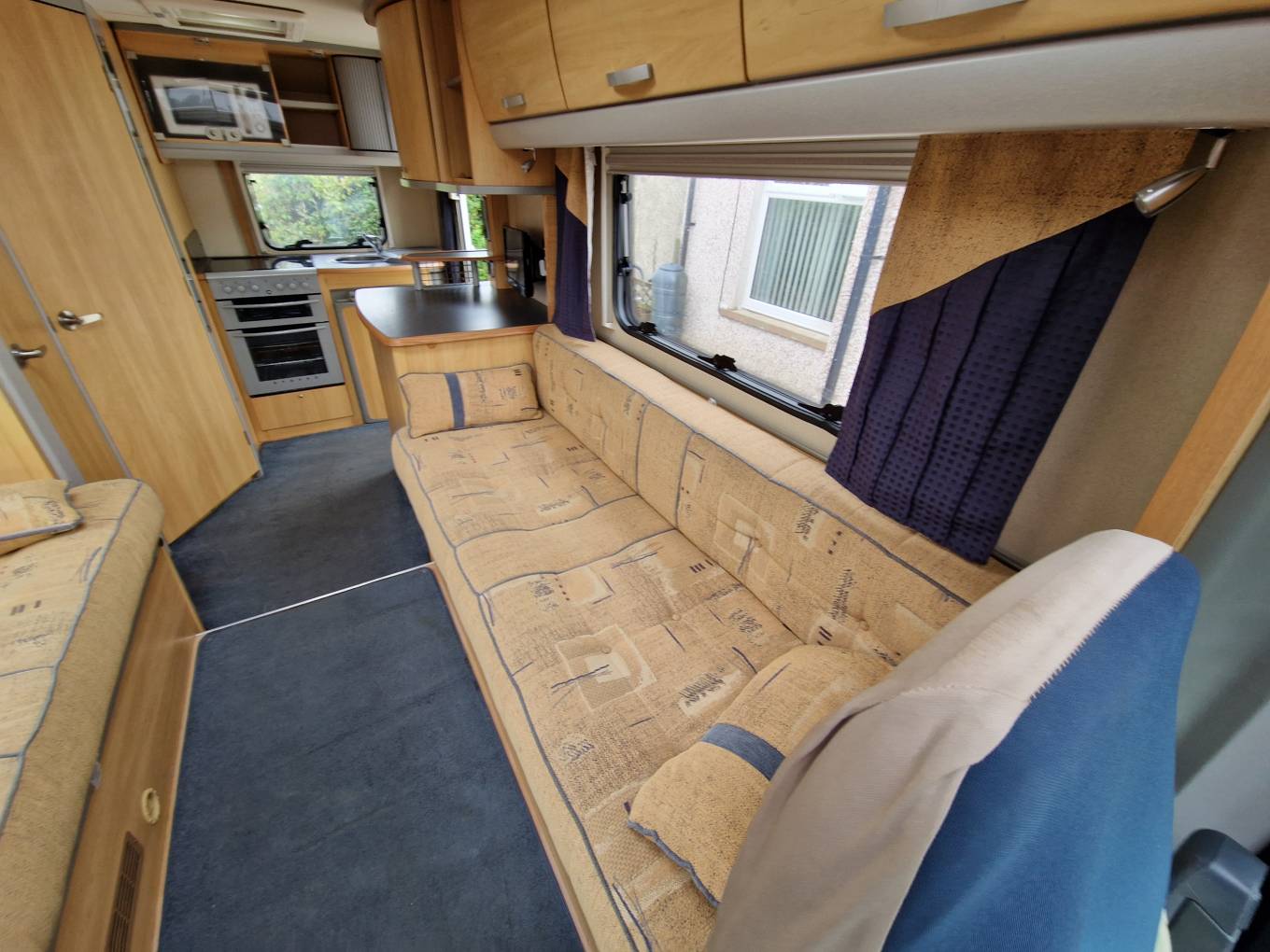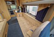 Internally, there is an end kitchen with plenty of room to work in - equipment includes an oven, grill, 3 +1 hob and a microwave, remote-cpntrolled extractor fan with rain sensor and plenty of storage space for a long trip away. Next to the kitchen is a decent sized washroom, with a cassette toilet, shower basin and vanity unit.
