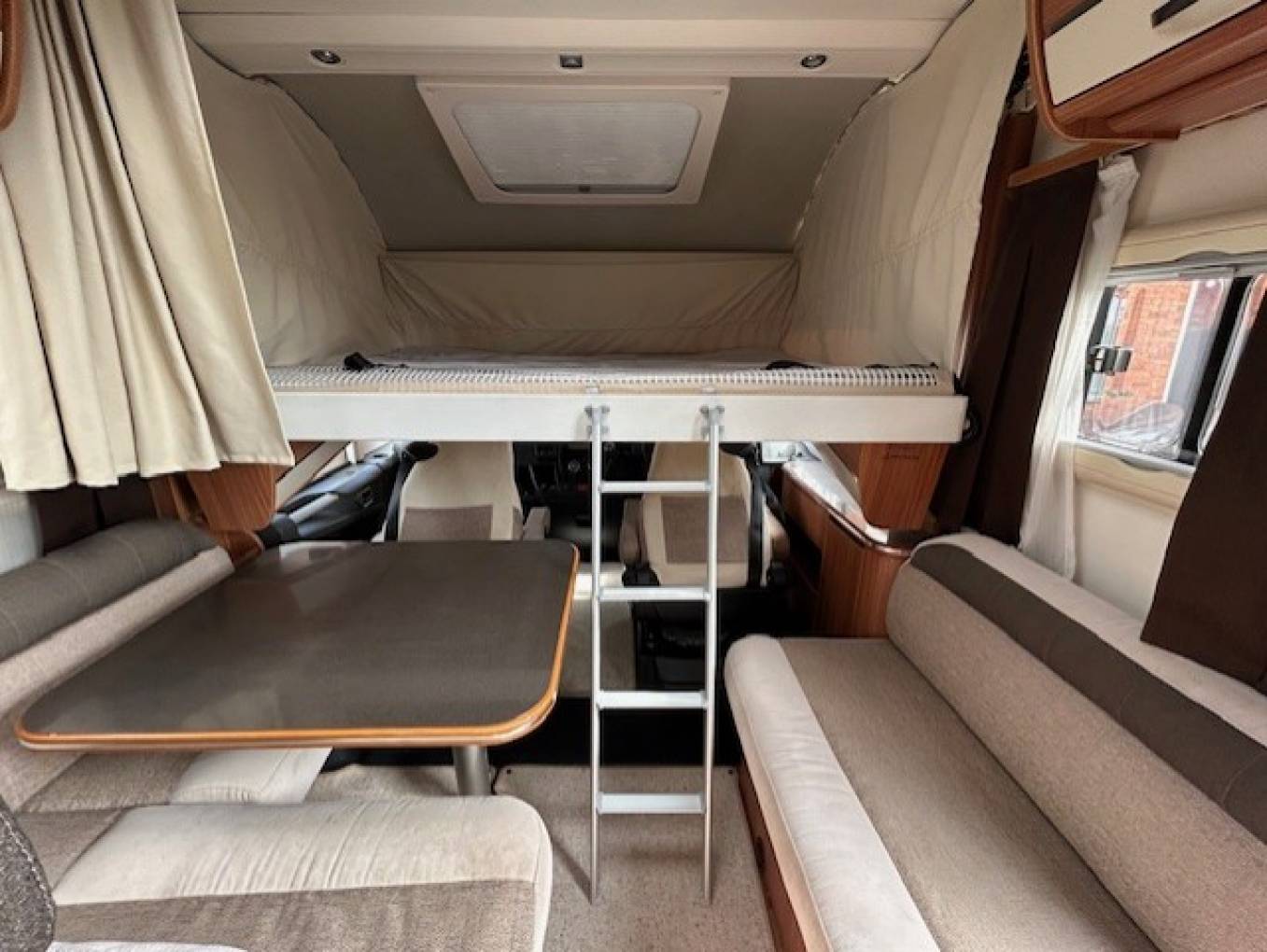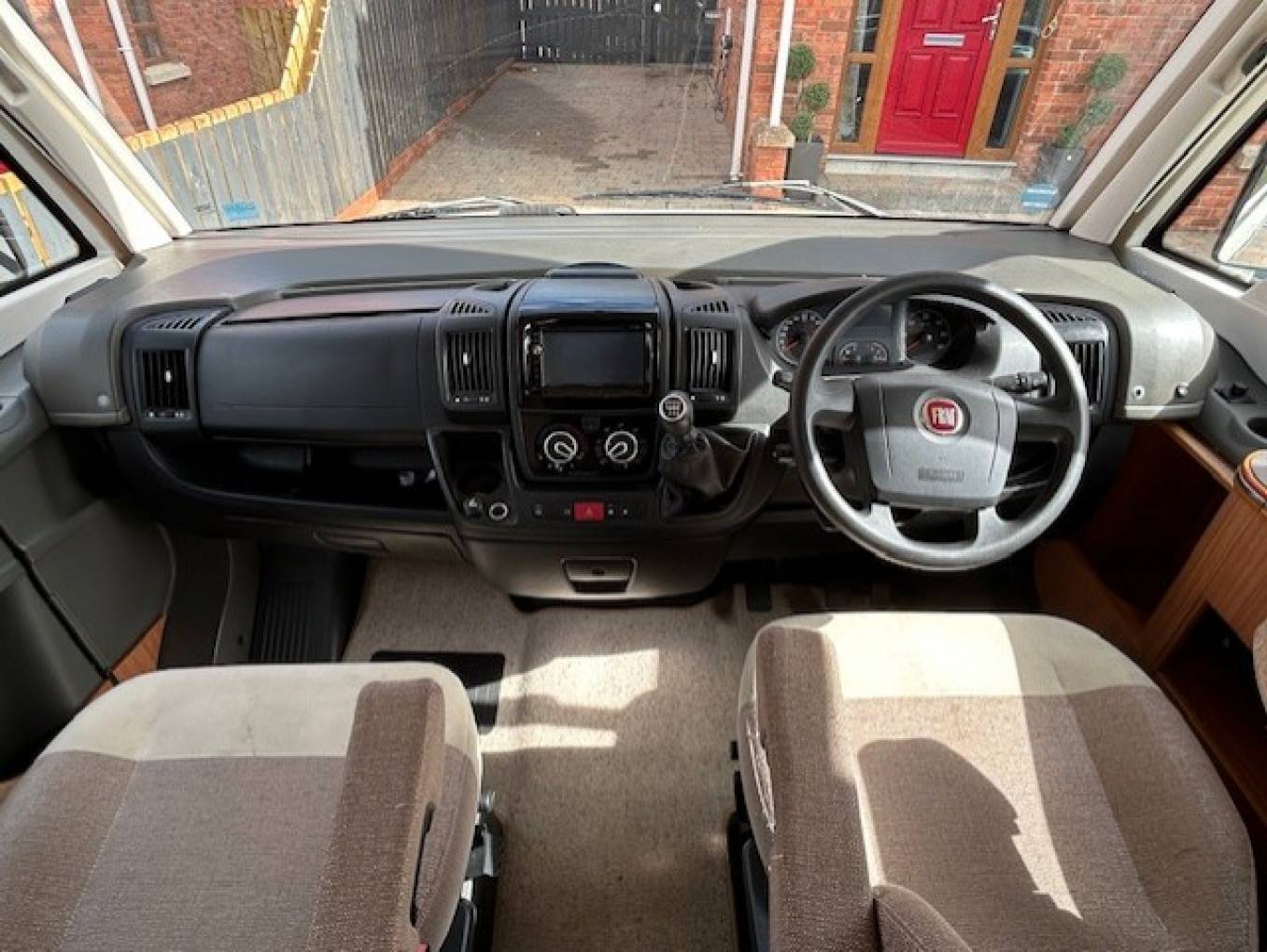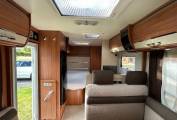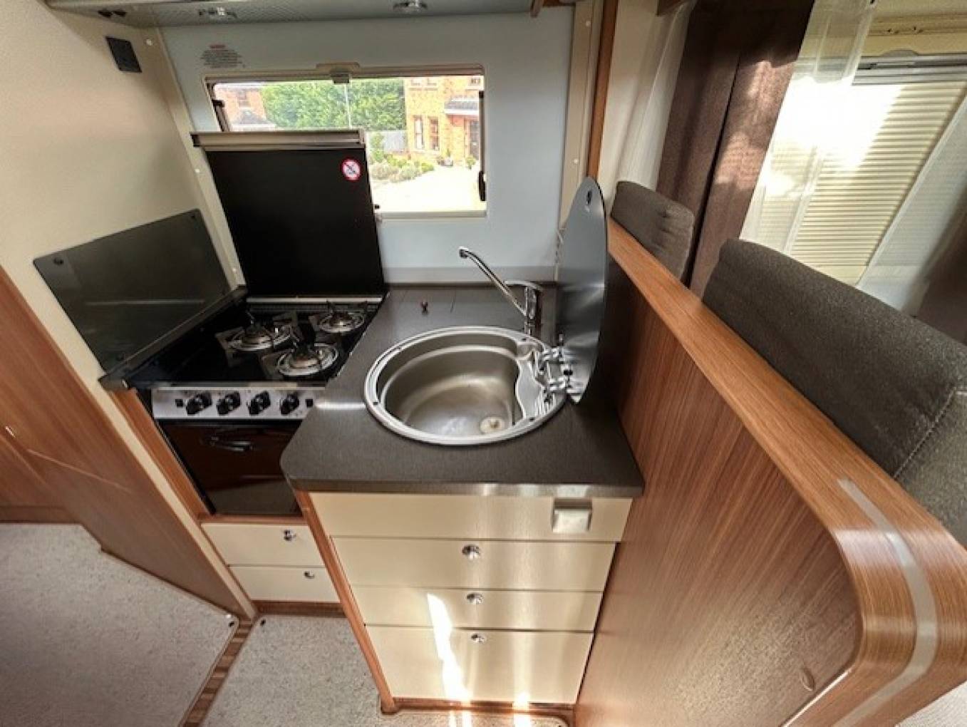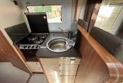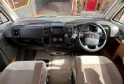 At the rear your en-suite bathroom has a separate shower cubicle with a wash hand basin and cassette toilet. The french bed has storage underneath and the electric drop down bed above the cab accommodates another 2 people. Fully functional kitchen has a 3 burner gas hob, oven, grill, stainless steel sink and a 3 way fridge freezer. Plenty of storage lockers throughout the habitation area. Lounge/dinette is spacious and the 2 front Captain's chairs will swivel round to create more space for dining or relaxing.