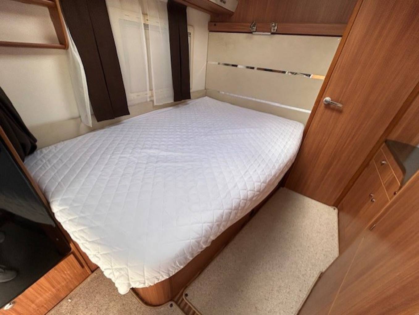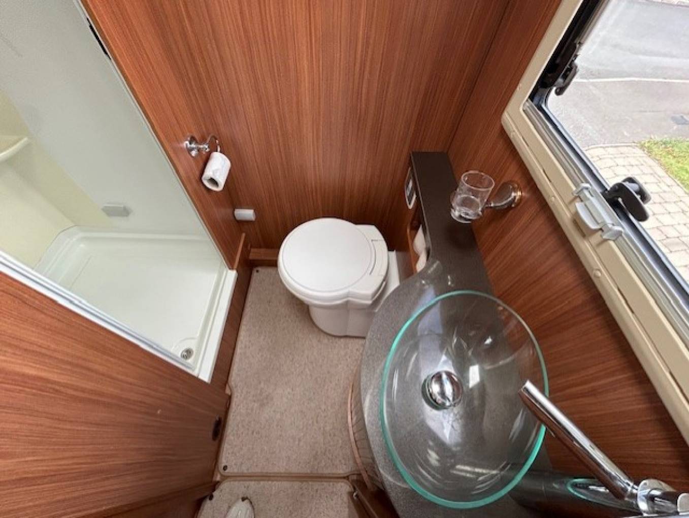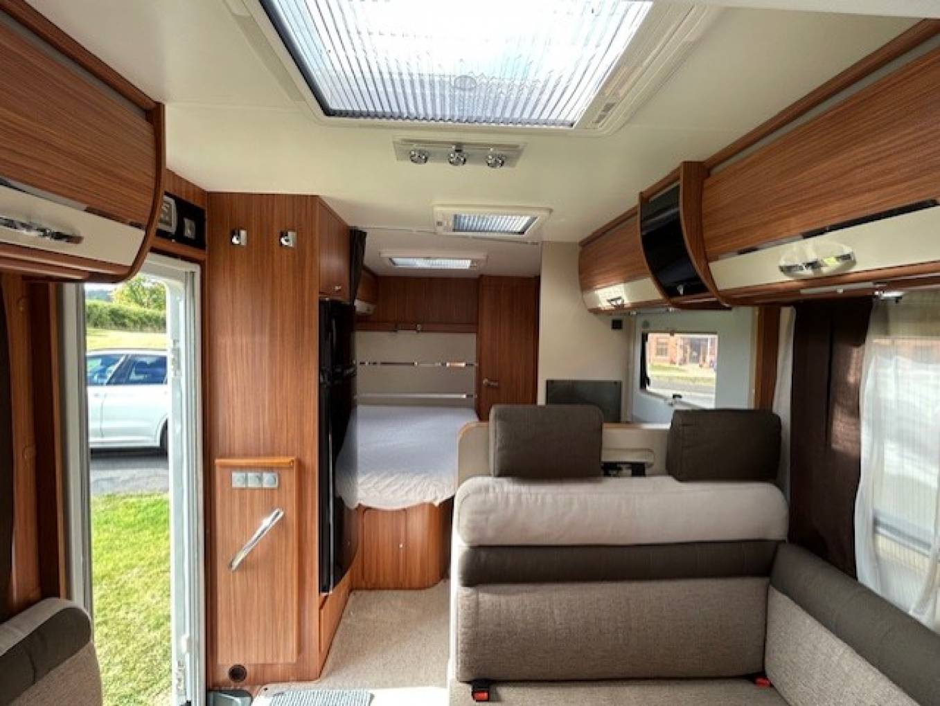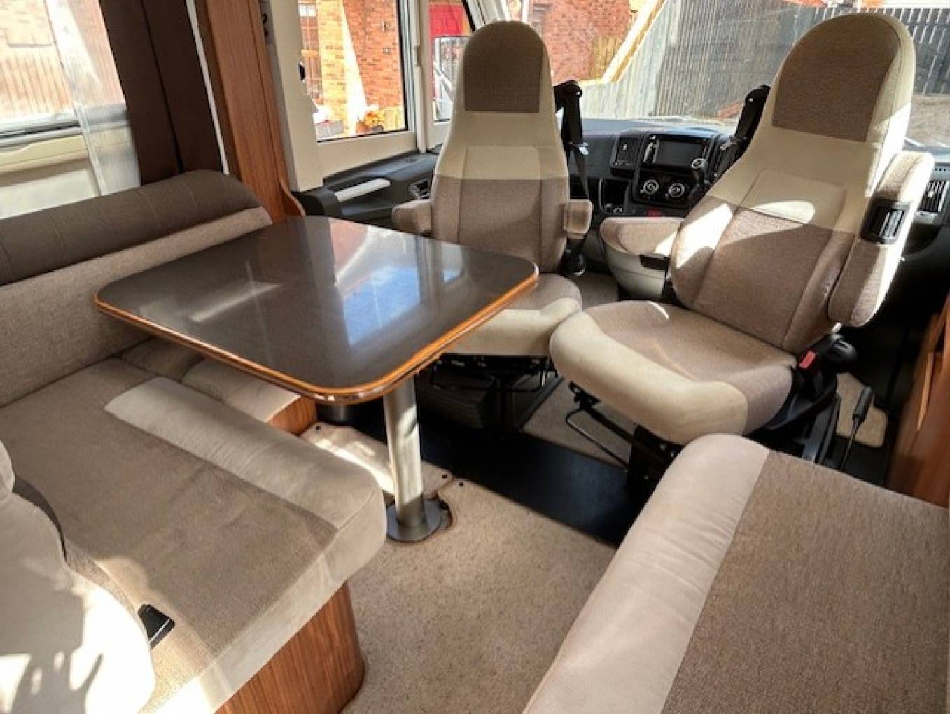At the rear your en-suite bathroom has a separate shower cubicle with a wash hand basin and cassette toilet. The french bed has storage underneath and the electric drop down bed above the cab accommodates another 2 people. Fully functional kitchen has a 3 burner gas hob, oven, grill, stainless steel sink and a 3 way fridge freezer. Plenty of storage lockers throughout the habitation area. Lounge/dinette is spacious and the 2 front Captain's chairs will swivel round to create more space for dining or relaxing.