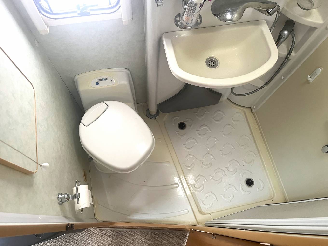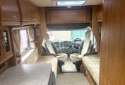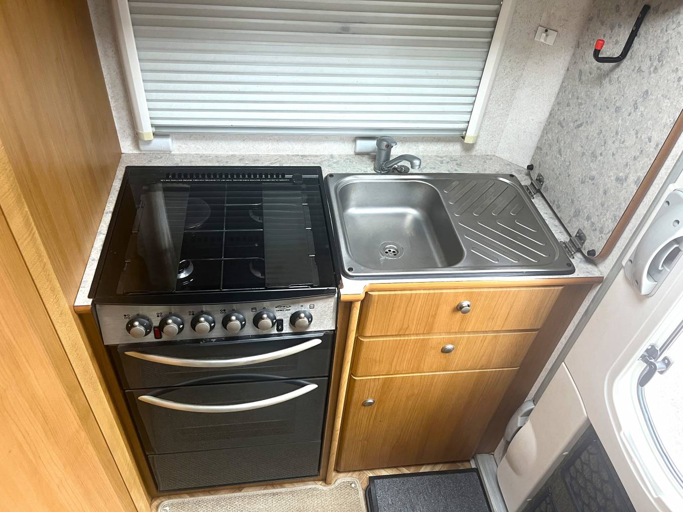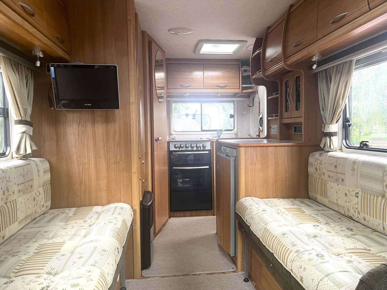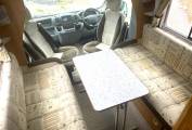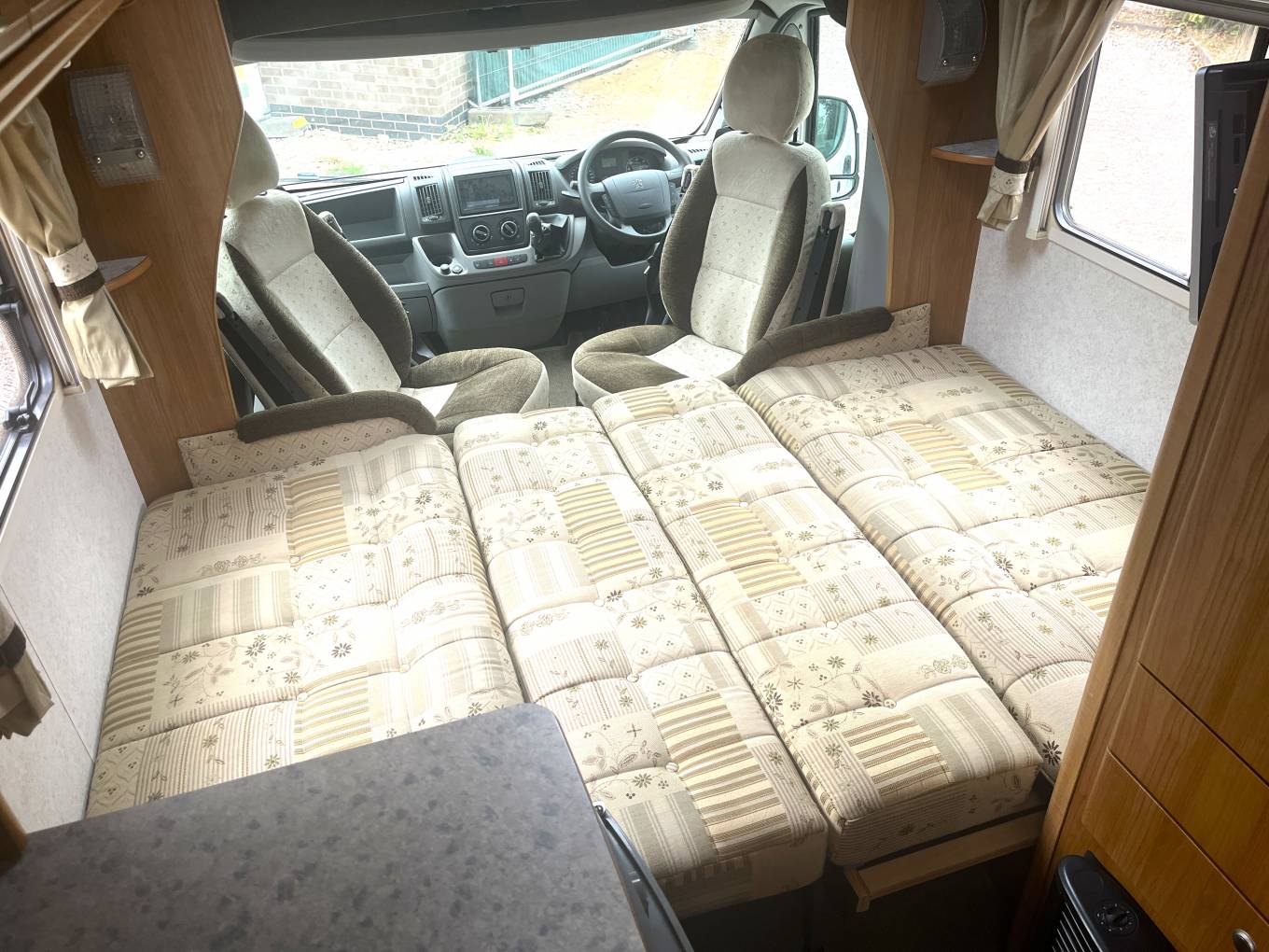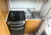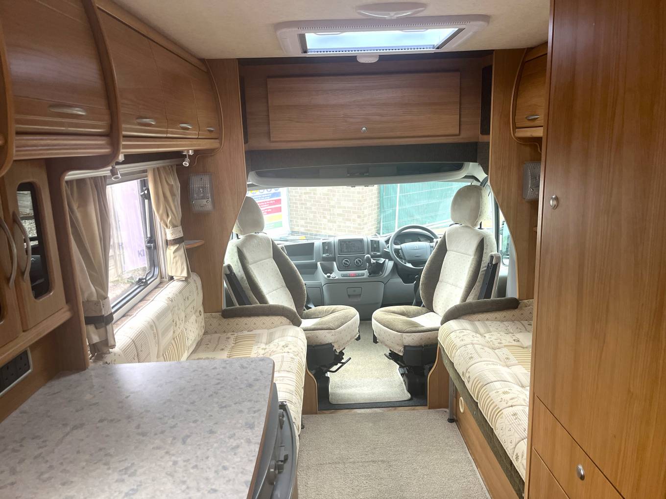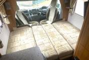 This is the Starfire model, a nice compact but Tardis like motorhome with features that include an end kitchen with full oven, gas hob and grill, sink, three wat fridge /freezer. The side bathroom has cassette toilet and separate shower. Moving into the lounge area are we have two comfortable bench seats that can be easily made into a double bed in the evenings and plenty of overhead storage.