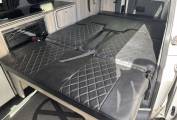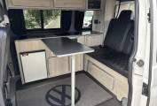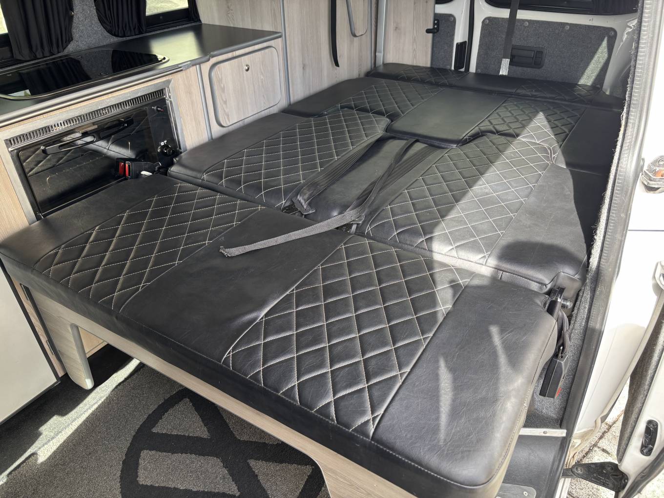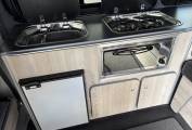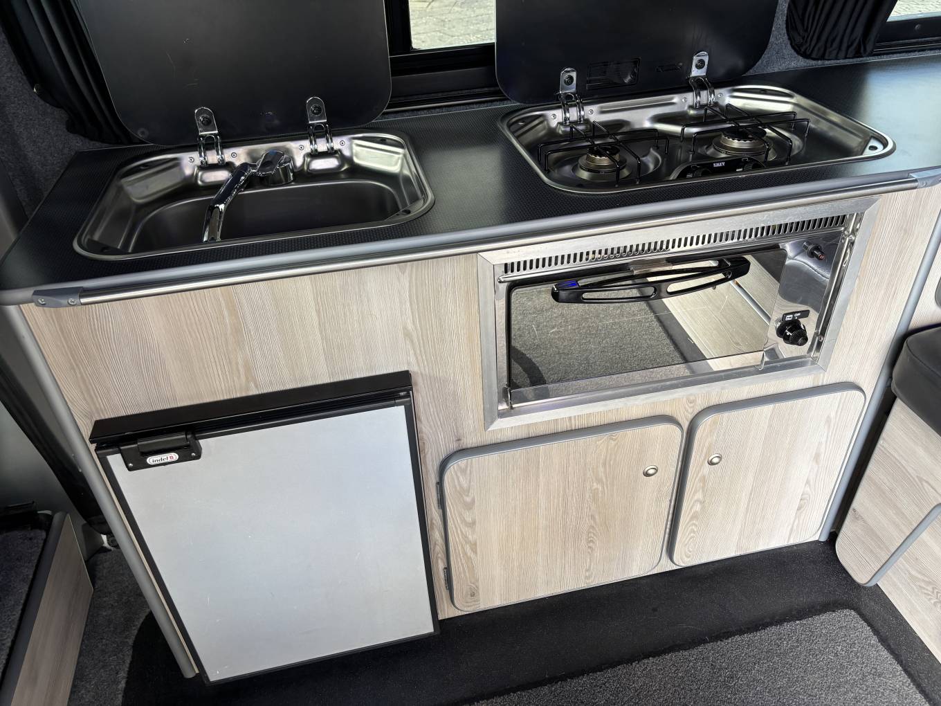 Inside, the flexible layout features a rock ’n’ roll double bed and a pop-top roof with an additional double bed or extra headroom. The kitchen area is well equipped with a sink, 2 gas hobs, oven, grill, and fridge, while a removable table provides a convenient dining setup. A double swivel seat adds to the living space, and there’s plenty of cupboard storage as well as various power sockets throughout for convenience.
