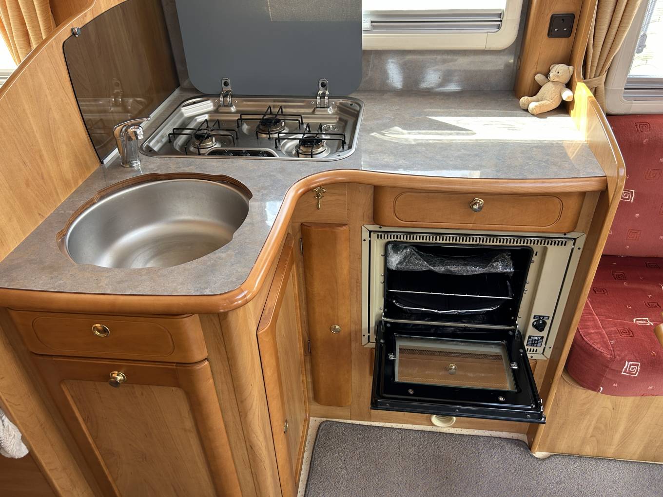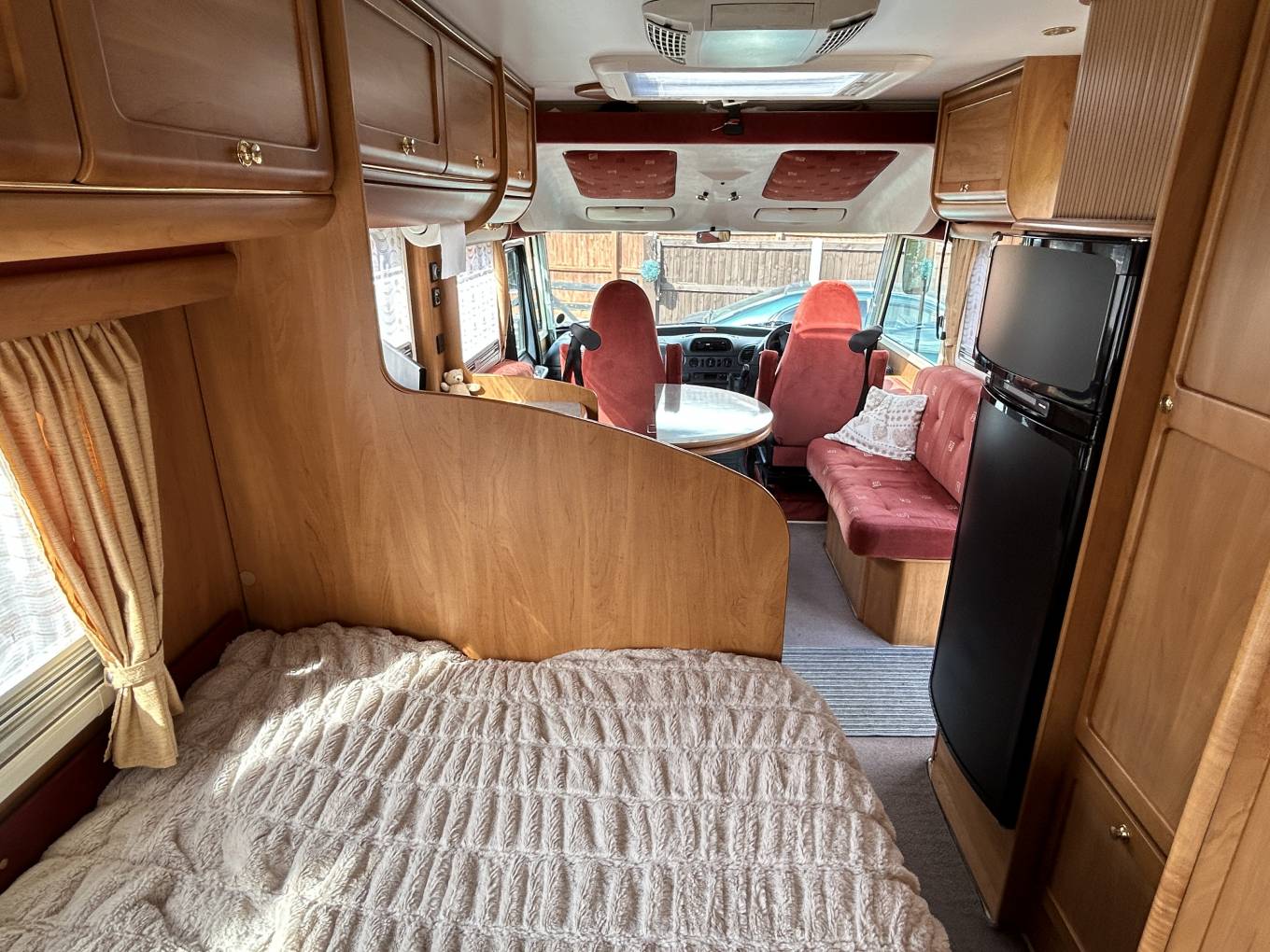 Inside, the layout is both practical and comfortable, featuring a fixed rear bed with a washroom alongside that includes a separate shower, washbasin, and toilet. The mid-kitchen is fully equipped with an oven and grill, 3-burner gas hob, and a large fridge freezer, while the spacious lounge benefits from an airy design and two swivel cab seats, allowing up to six people to dine together with ease. Sleeping arrangements cater for four, with the fixed rear double bed and a large pull-down double bed above the cab.