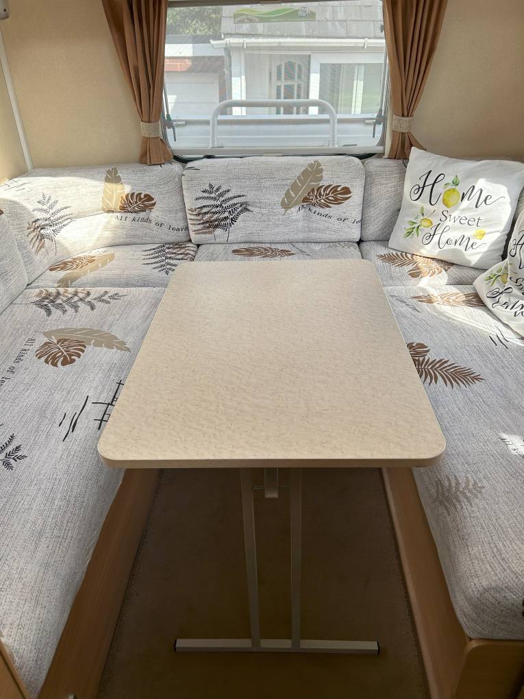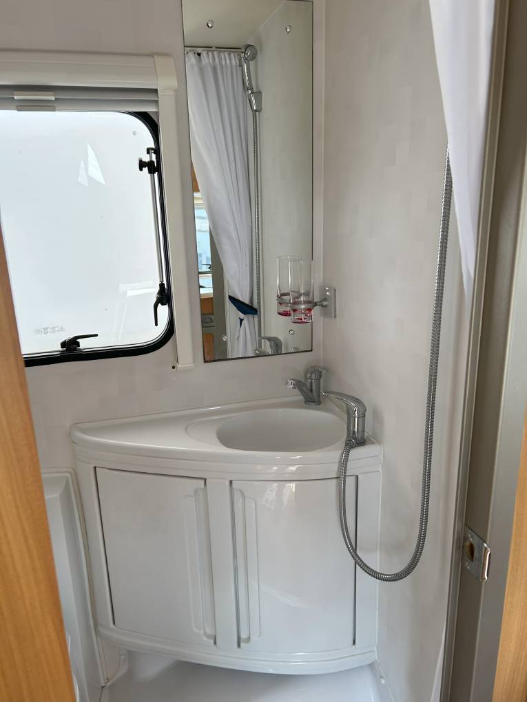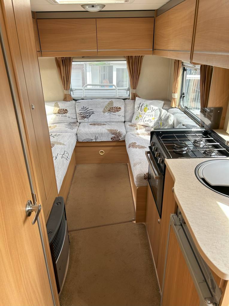 The vehicle’s layout comprises of a rear U-Shape lounge an overcab bed and a good sized side kitchen with opposing washroom area.