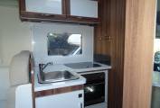 Moving to the center you have the practical and well-appointed L shaped kitchen featuring a stainless steel sink with mixer tap, three-ring gas hob, oven and grill, large 3-way fridge with freezer and ample storage in drawers and cupboards.