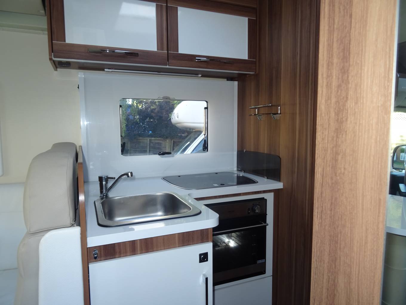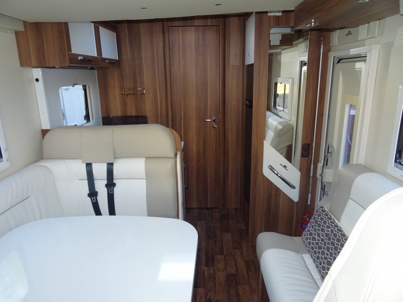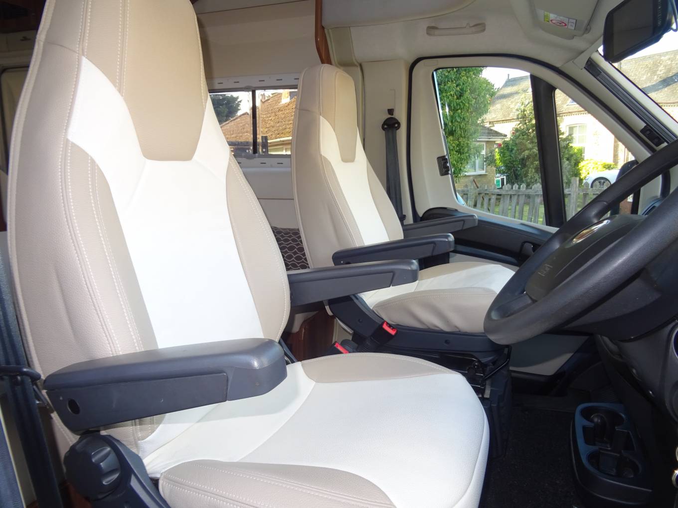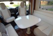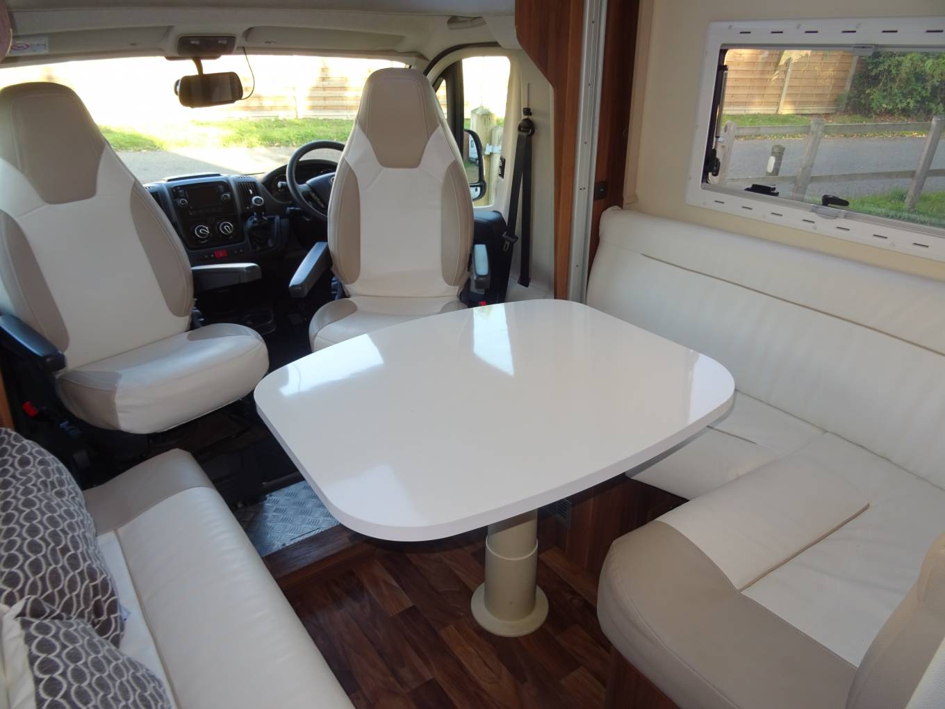 As you enter the side door to your left you have large seating area with adjustable table, both front seats swivel round making this area a great area to relax or dine in.