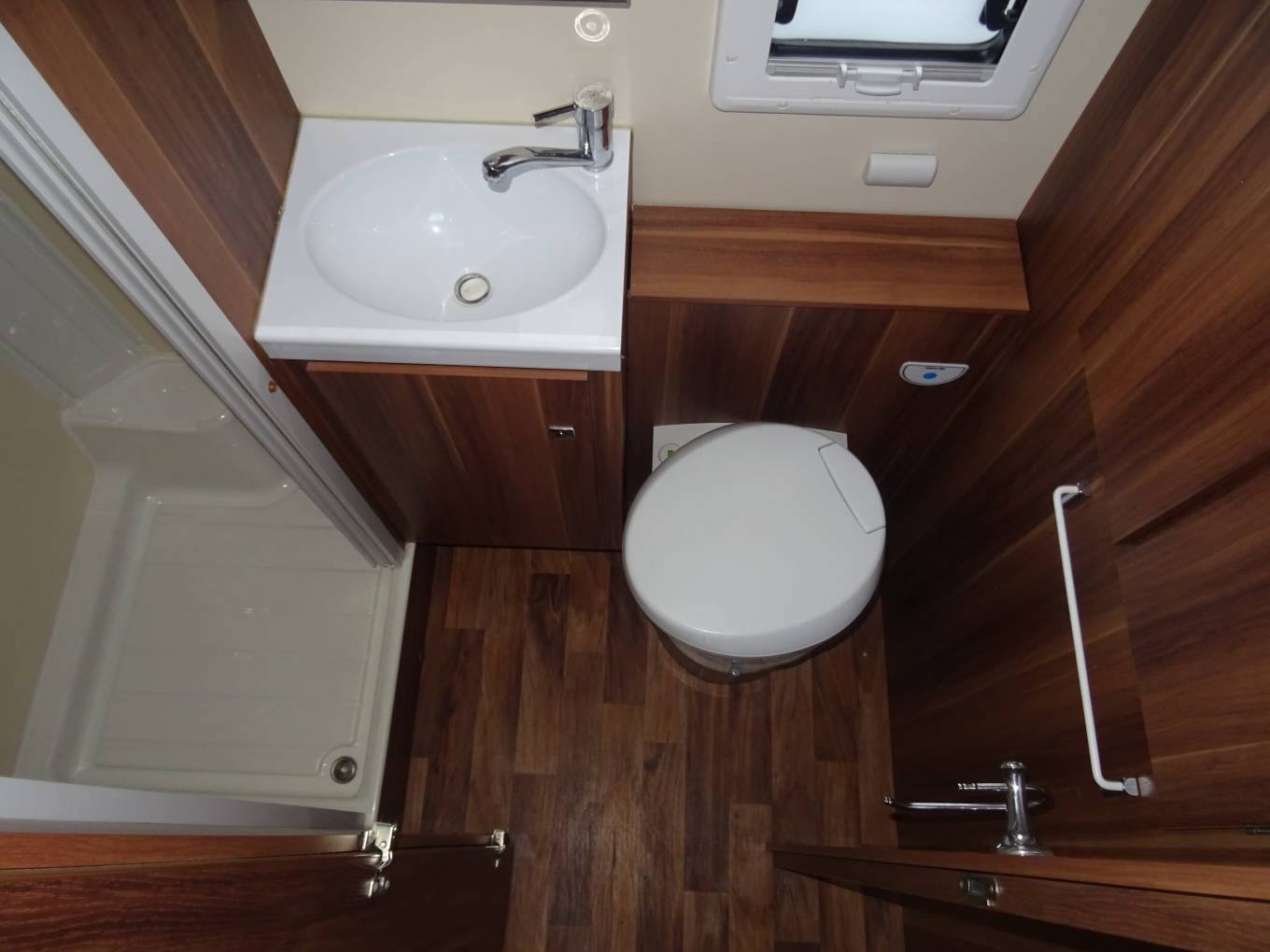 Moving to the rear is the spacious washroom with a separate walk-in shower, cassette toilet, large wardrobe and generous side storage cupboard.