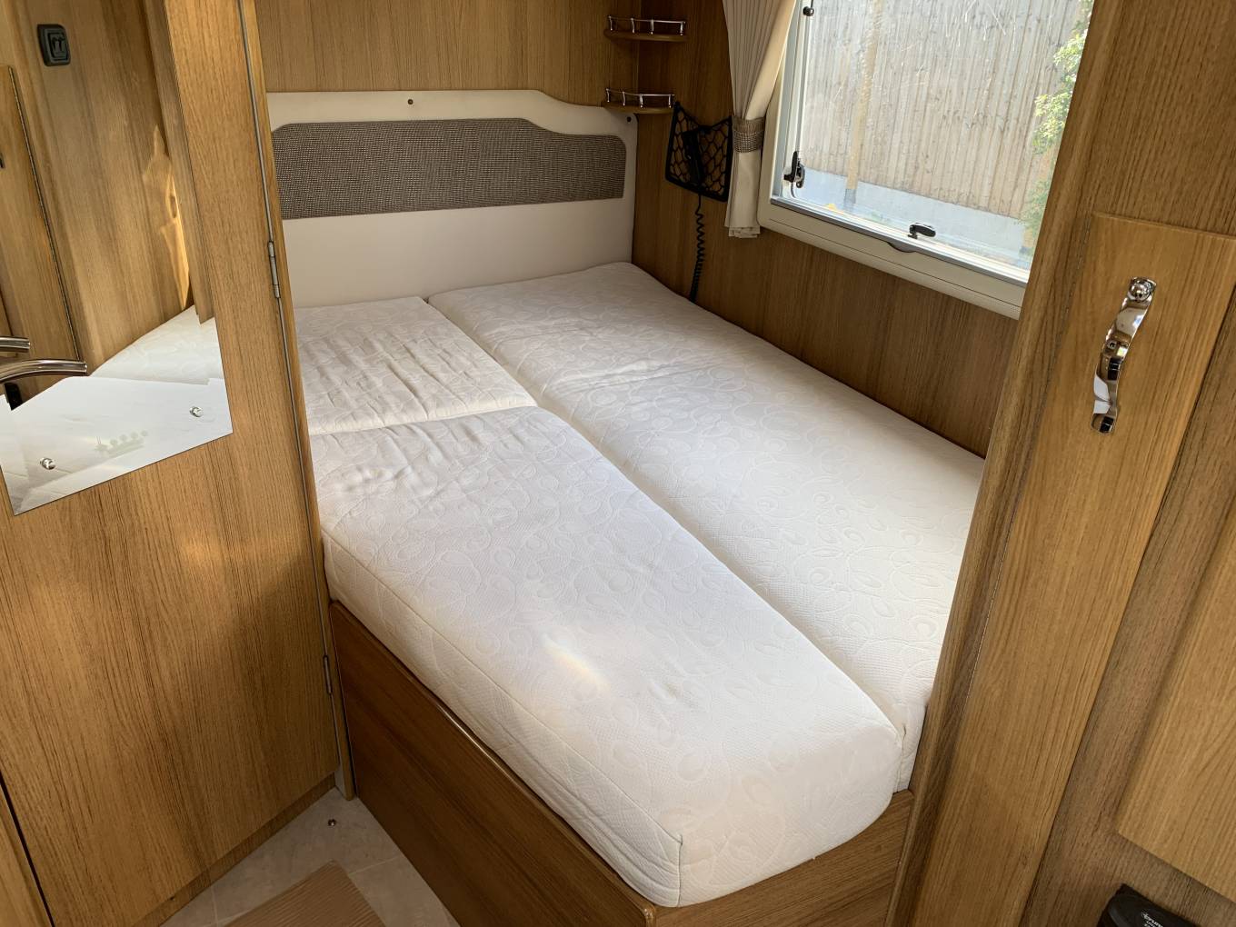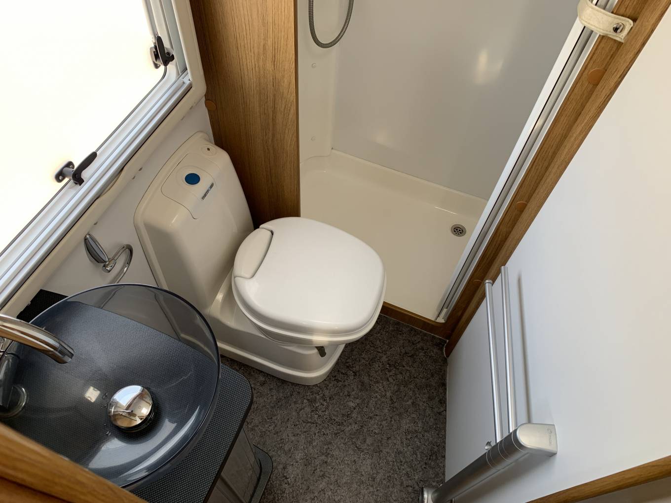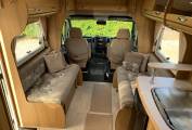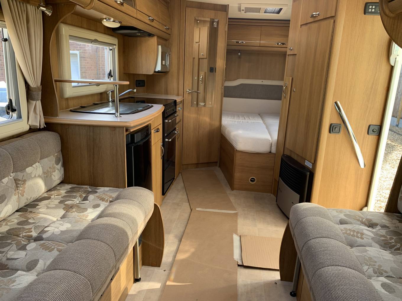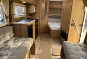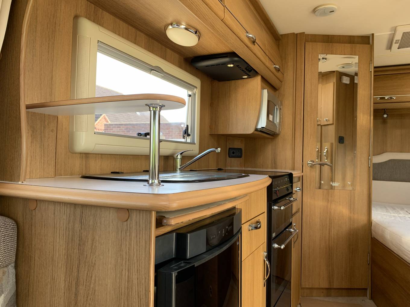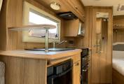 Layout comprises rear fixed nearside french bed, adjacent bathroom, central fully equipped kitchen and side facing bench seats for the lounge.