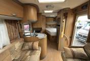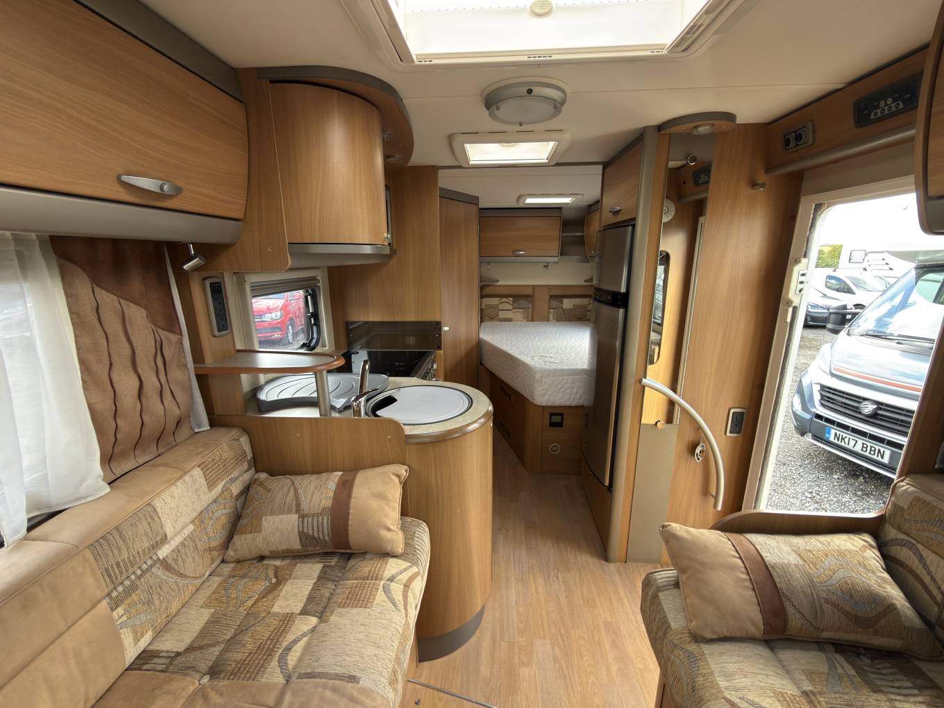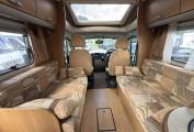The practical central kitchen area provides everything needed. The Thetford 3 gas burner and 1 electric plate Hob, oven and grill, microwave, 3 way large fridge with freezer box, sink with mixer tap, and excellent all round storage. The lounge has facing sofas and easily converts to a large double bed, both cab seats swivel and there are stored away tables for our diner.