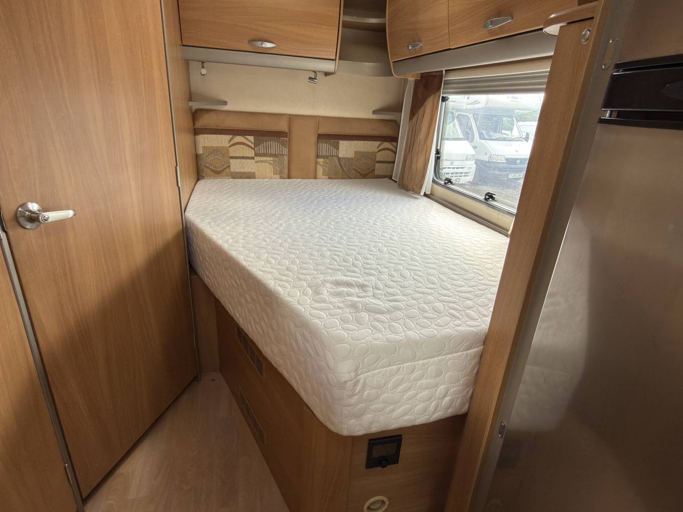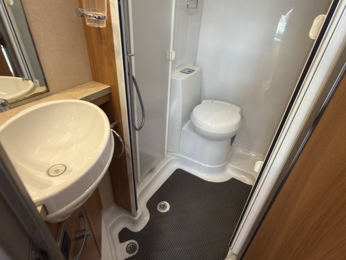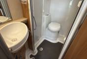 Rear fixed french bed layout, the bed lifts up for storage, a concertina door separates off this area and also within a TV Point , washroom and large hanger wardrobe. the washroom has solid twin bi-fold doors for a separate shower, and is well equipped with basin, electric flush toilet and storage.