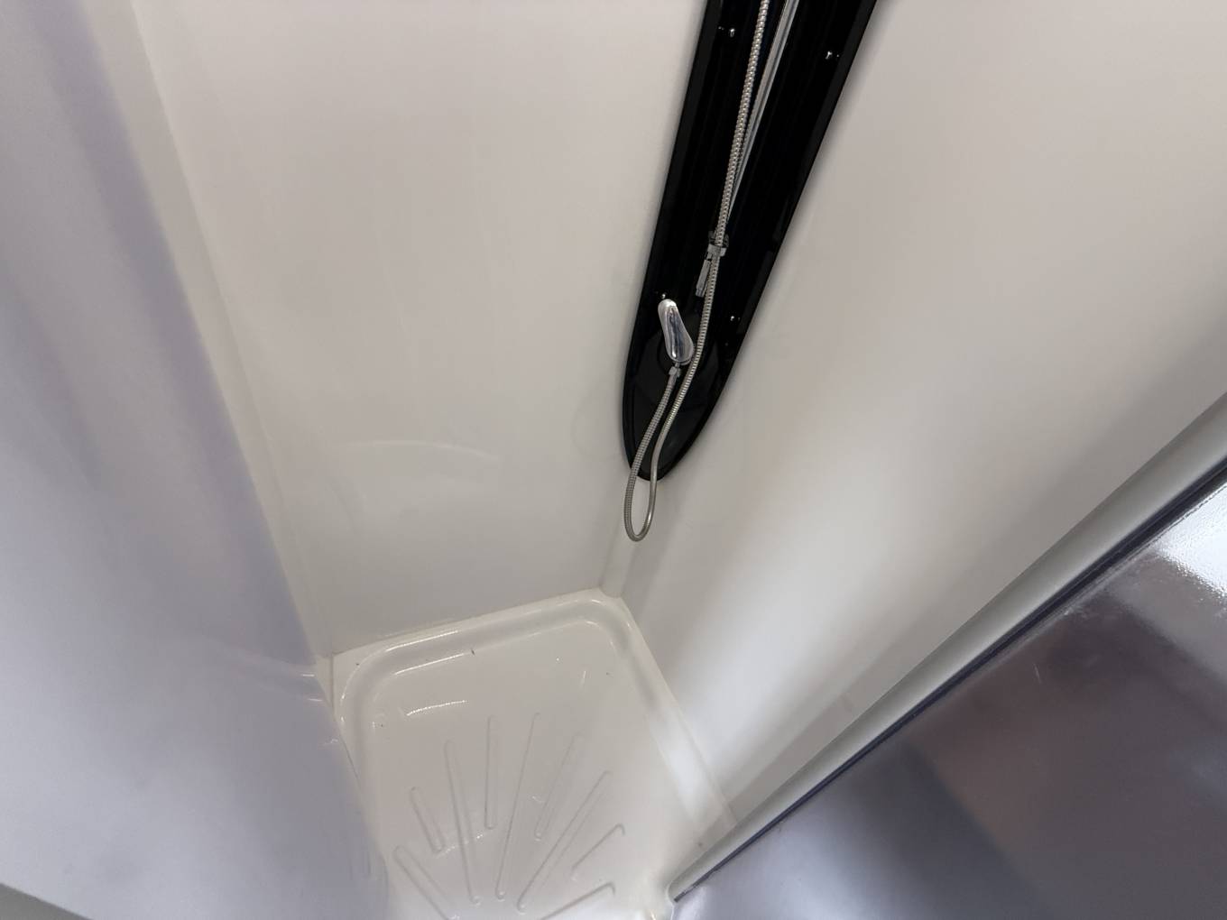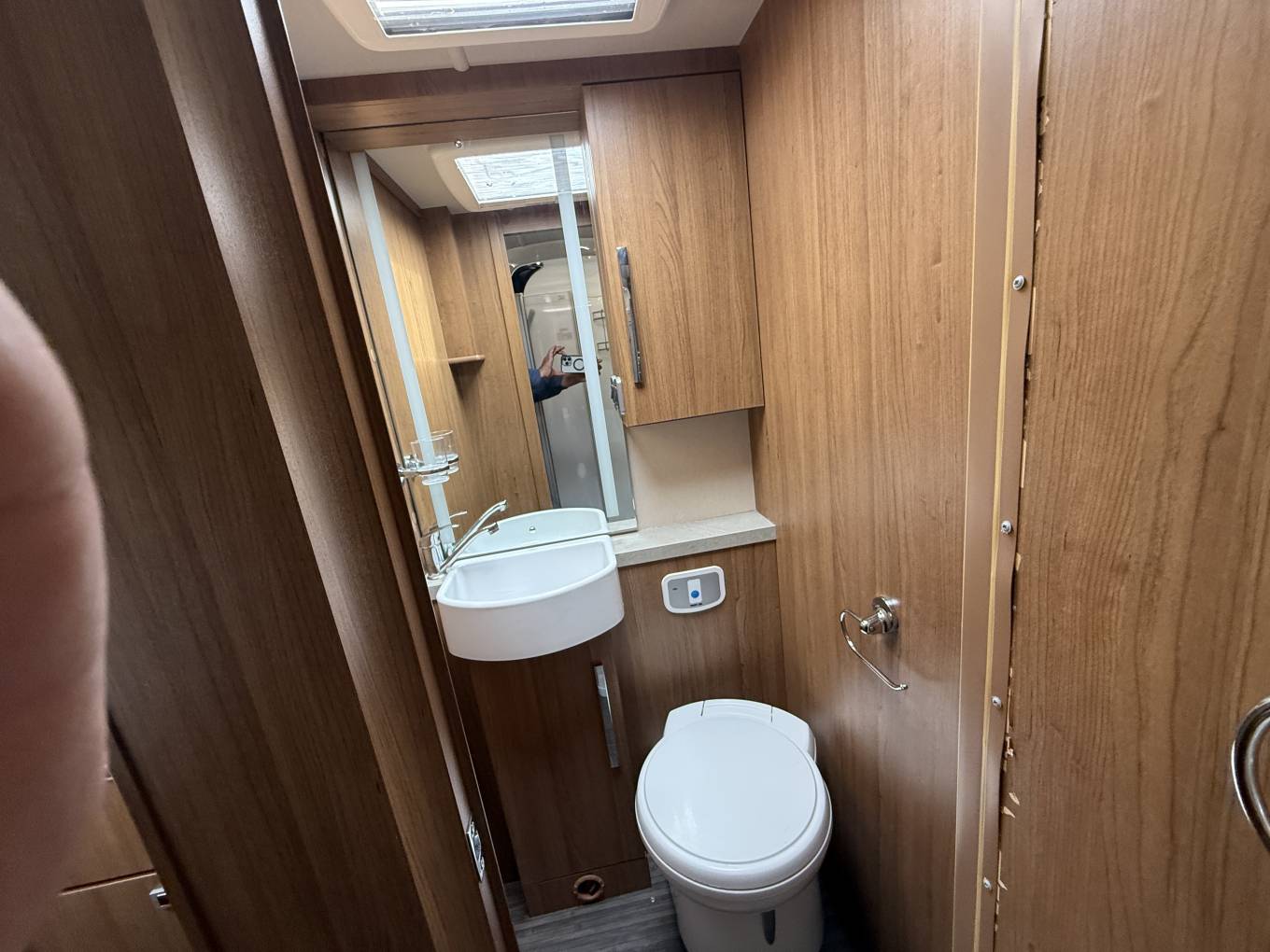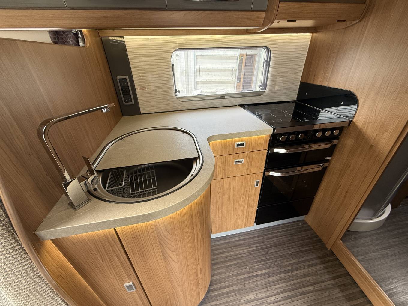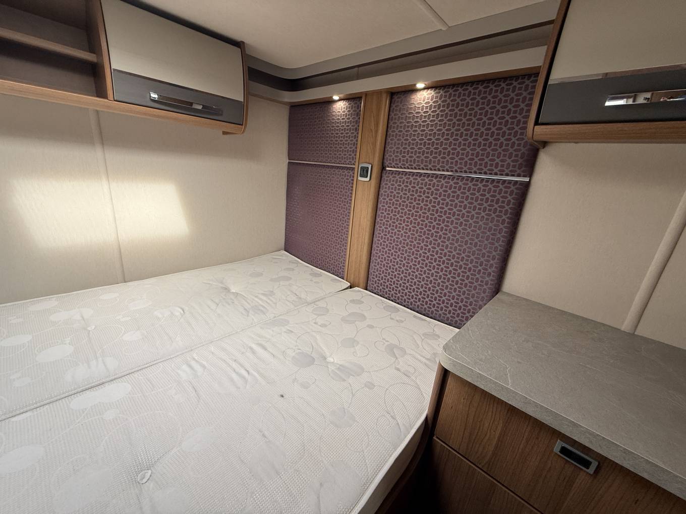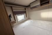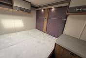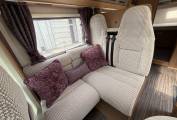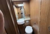 Key interior features are - transverse double bed across the back with storage lockers above. Immediately forward of the fixed bed, the washing facilities are split between a shower cubicle offside and toilet room on the nearside, the door for the latter can also be used for end-bedroom privacy. As throughout the whole vehicle, LED lighting here is excellent! All this still leaves space for a roomy lounge area, thanks in part to the easy swivel action of the cab seats. At night, the settee bases pull together for a second double bed (there’s also an extension to the shorter, nearside sofa).