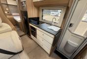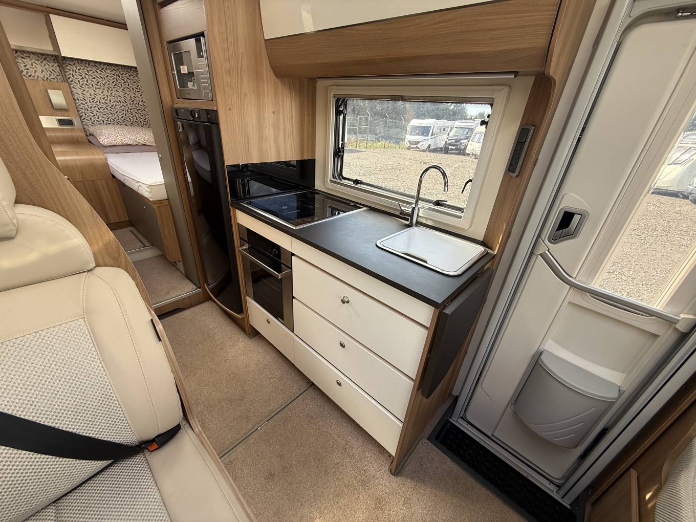 The layout is as you enter through the habitation door adjacent to the lounge area, you have the mid-ship modern and light kitchen area featuring a stainless-steel sink and mixer tap, glass covered Thetford three gas burner hob and electric hotplate with grill and oven below. Adjacent is the Dometic fridge with integral freezer unit and above is the Daewoo microwave.