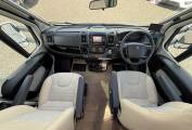 The L-shaped front lounge and dinette area which can also be set up as a half dinette with twin side seats includes a side seat, upper lockers and under seat storage with all upholstery in an excellent condition. There is a dining table that can be removed and stored in the floor space and the seating can be converted to a double bed at night if needed and there is an Avtex TV stored away in one of the top head height lockers. The front cab passenger and driver captain seats both swivel round to face the living area to create an excellent place to dine and relax, with a large Heki skylight overhead making it a light and an airy living space