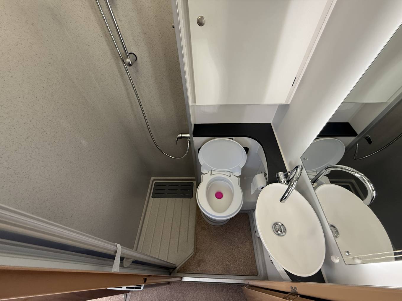 The washroom has a walk-in shower cubicle with bi-fold dividing door, washbasin with a chrome mixer tap, a Thetford cassette swivelling toilet with electric flush, skylight for ventilation and a medicine cabinet and mirror.