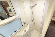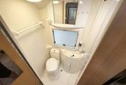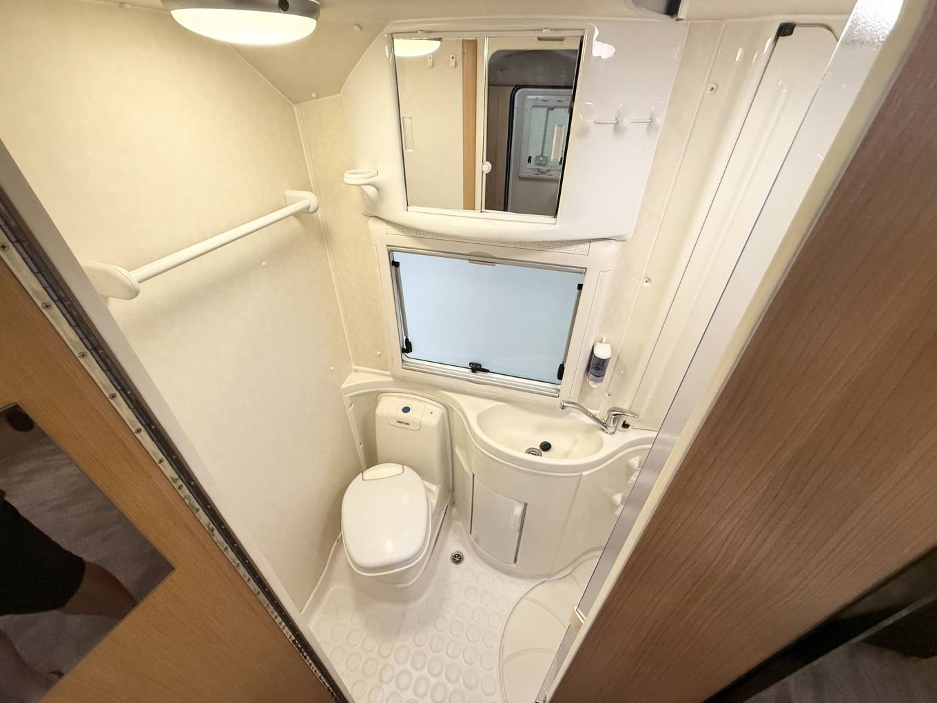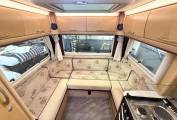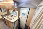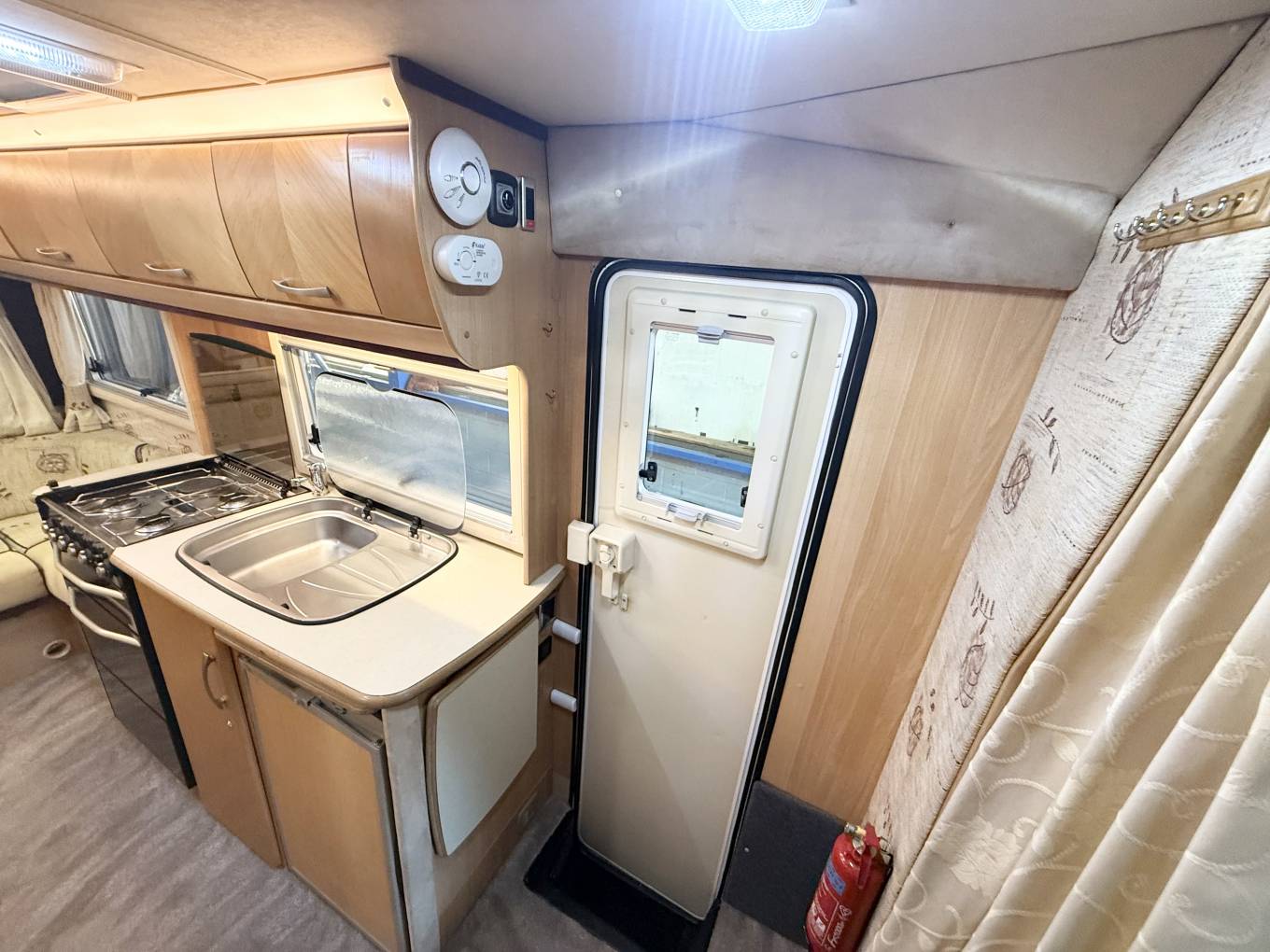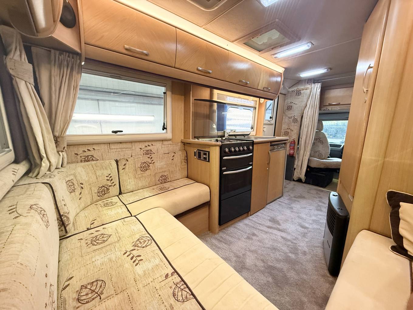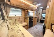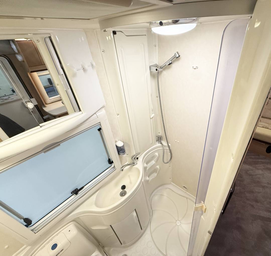 On entering via the caravan door which has an added security lock and grab handle, also a flyscreen. The fully equipped kitchen consists of a three gas burner and one electric hob, a separate grill and separate oven, a sink with a drainer and plenty of cupboards. The Three Way Dometic Fridge is the other side of the door with worktop above plus a cocktail cabinet and a television unit above that containing relevant sockets and connections. In the corner bathroom the Thetford Toilet on the left, wash handbasin in the middle and a separate shower on the right. Forward of the bathroom is the wardrobe with a Truma gas and electric heater below. The central lounge has a large settee on the driver’s side and twin seats facing each other on the passenger side. The forward facing pair have three point seatbelts. A removable table hooks on the wall here for dining. Both sides convert to single beds and when pulled together make a sizeable double. The driver’s seat also swivels to increase the lunging area. Above the cab there is useable cupboard space.