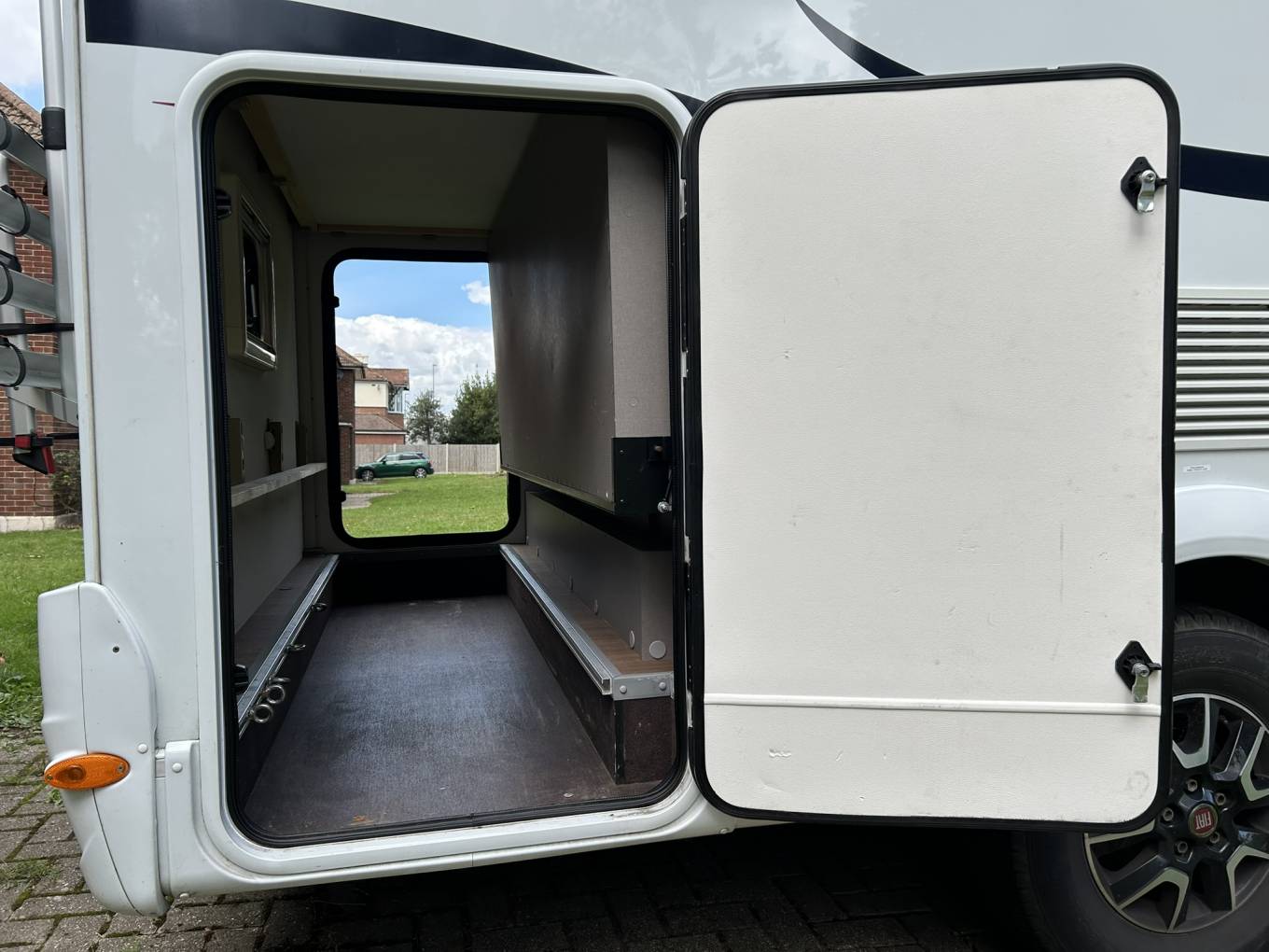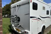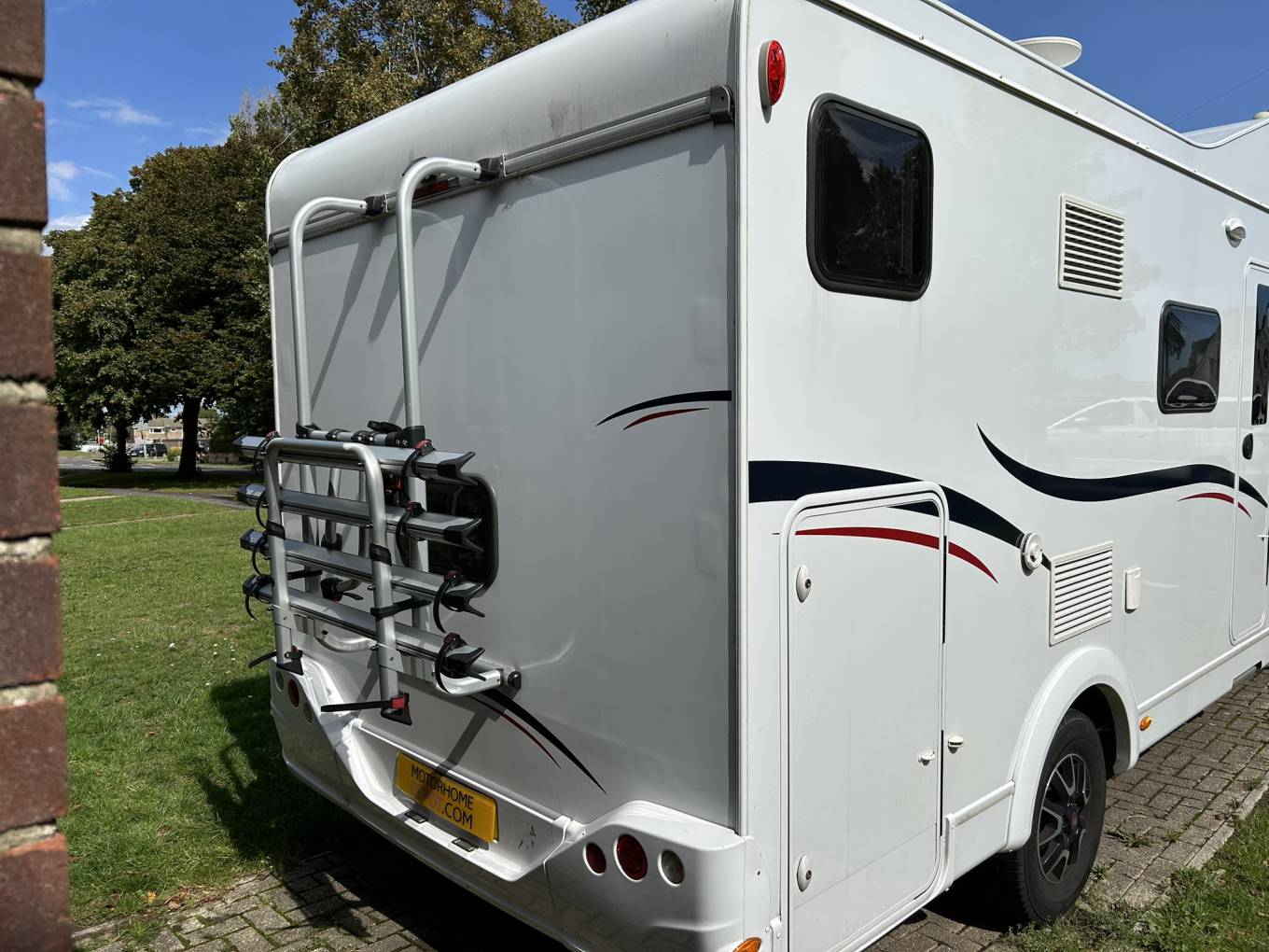 Outside the van is a large garage, alloy wheels, attachable inflatable awning, Gasflow refillable system and a bike rack.