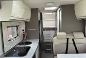 As you enter the van to the right is a ladder to access the large over-cab bed with a skylight and window for natural light and a privacy curtain.