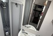 Moving through the van you'll find the washroom on the right hand side with a shower cubicle, hand basin with mixer tap and small vanity unit, cassette toilet and mirror.