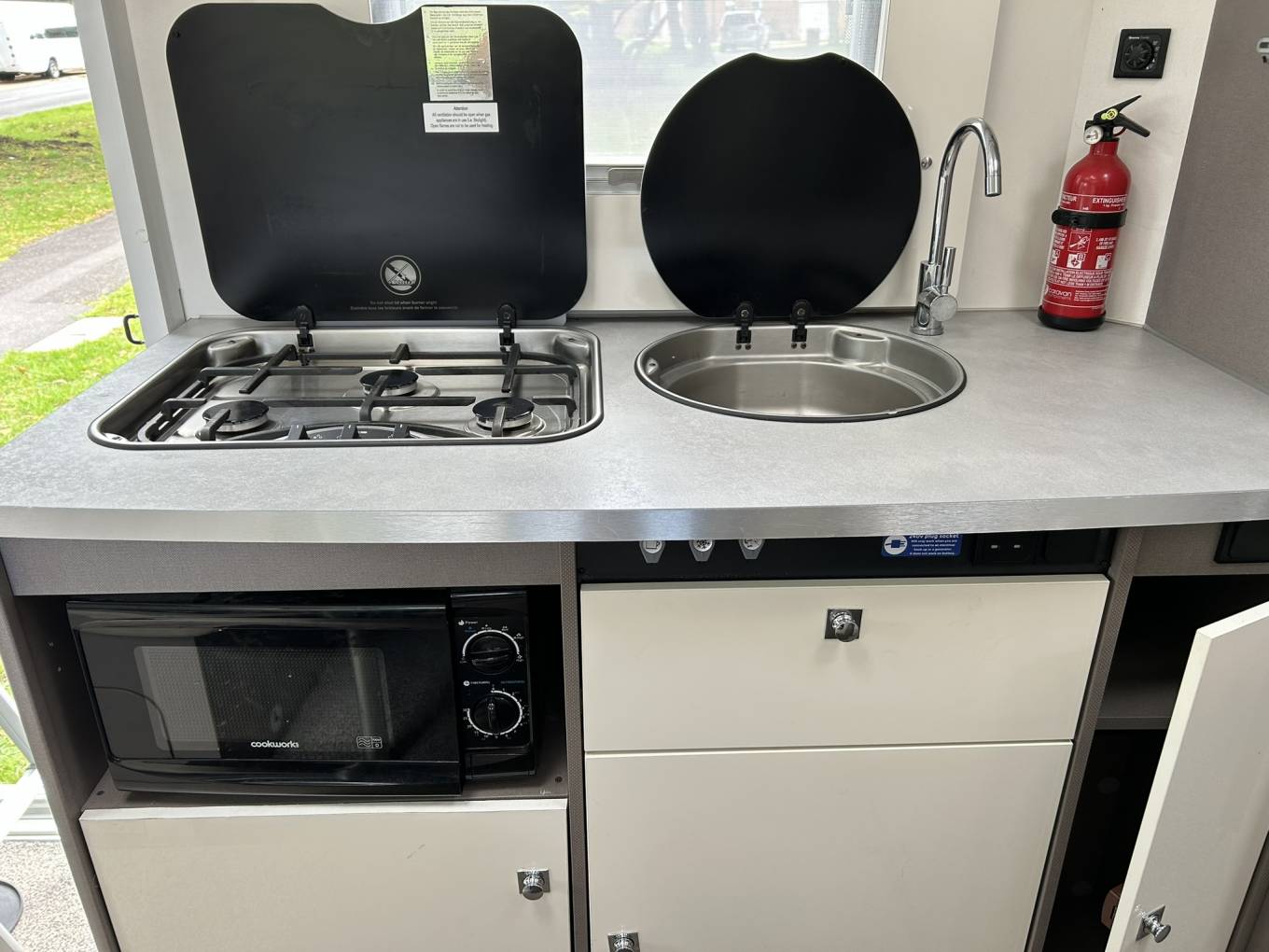 To the left is a modern kitchen comprising of a 3 ring gas hob, microwave, large fridge freezer, sink with mixer tap and plenty of cupboard/locker space for all your kitchen essentials.