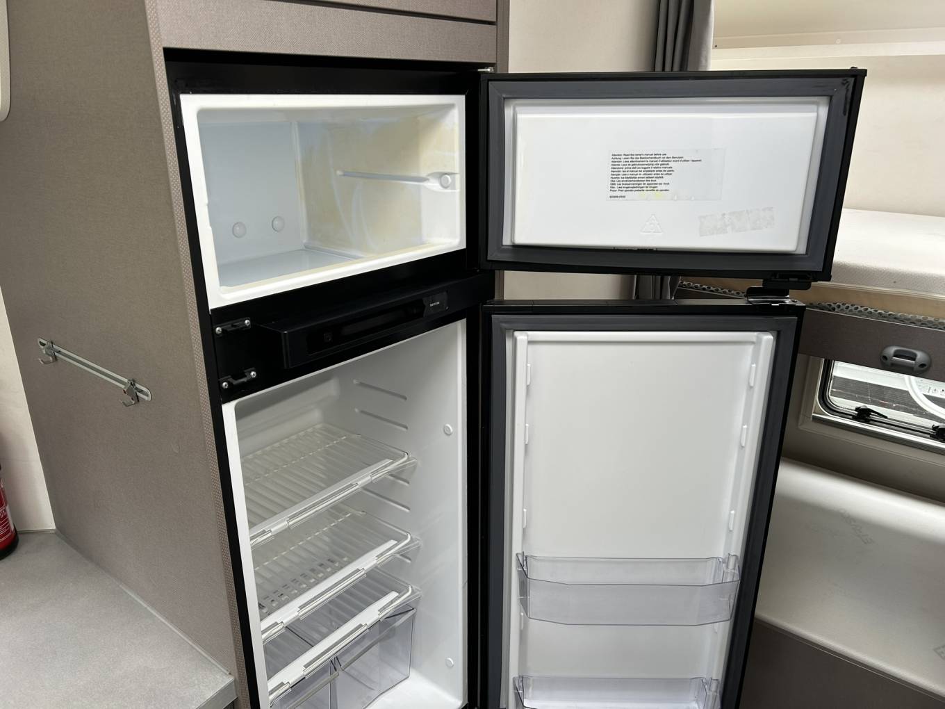 On the left is a wardrobe to store clothes and is currently set out as shelves. At the rear of the motorhome are 2 full sized bunk beds, ideal for those family holidays, the bottom bunk lifts during travel to allow extra garage space. There is a ladder for access and windows for natural light.